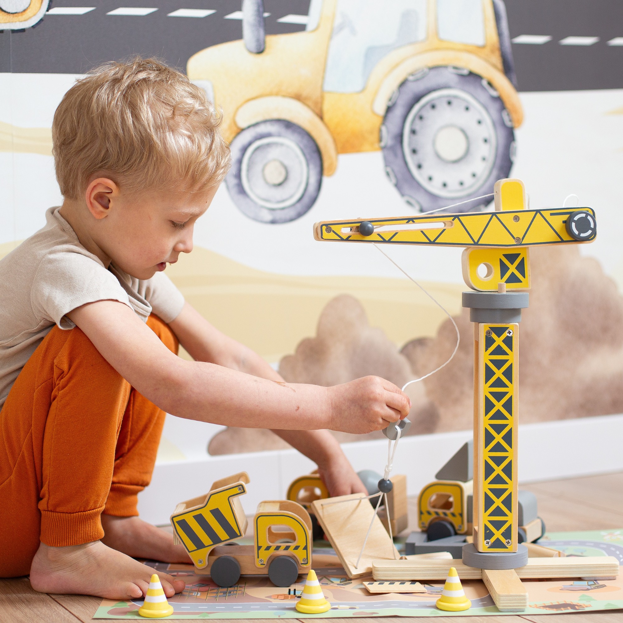 Ući u ulogu graditelja san je mnogih klinaca. U njihovoj realizaciji pomoći će im drvena konstrukcija s brojnim elementima za maštovitu igru. Set uključuje između ostalog: divovska dizalica koja rotira i podiže građevinski materijal na posebnoj platformi. Precizno dorađena vozila kreću se posebnom podlogom koja imitira gradilište. Cjelinu upotpunjuju barikade i čunjevi koji služe kao upozorenje prolaznicima.