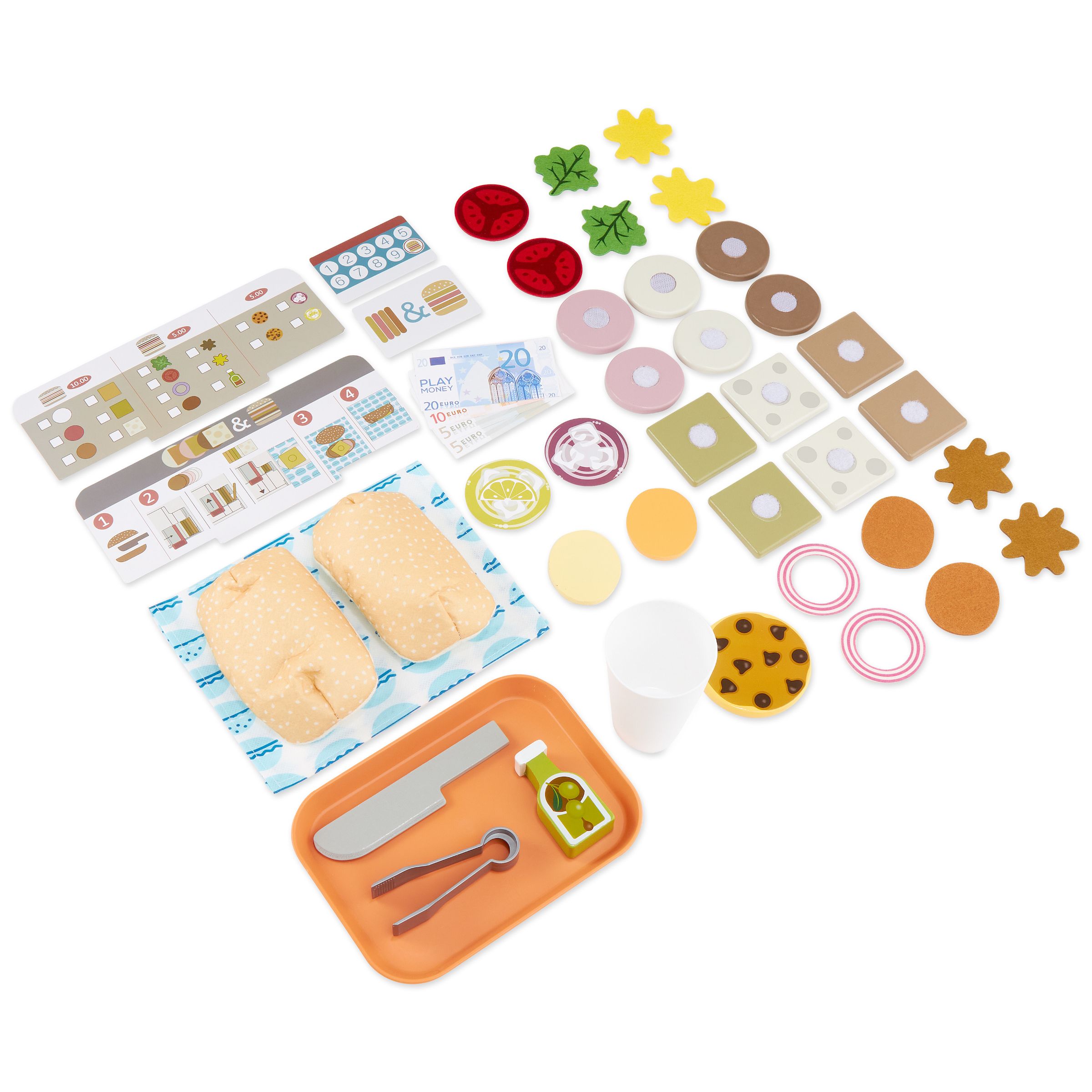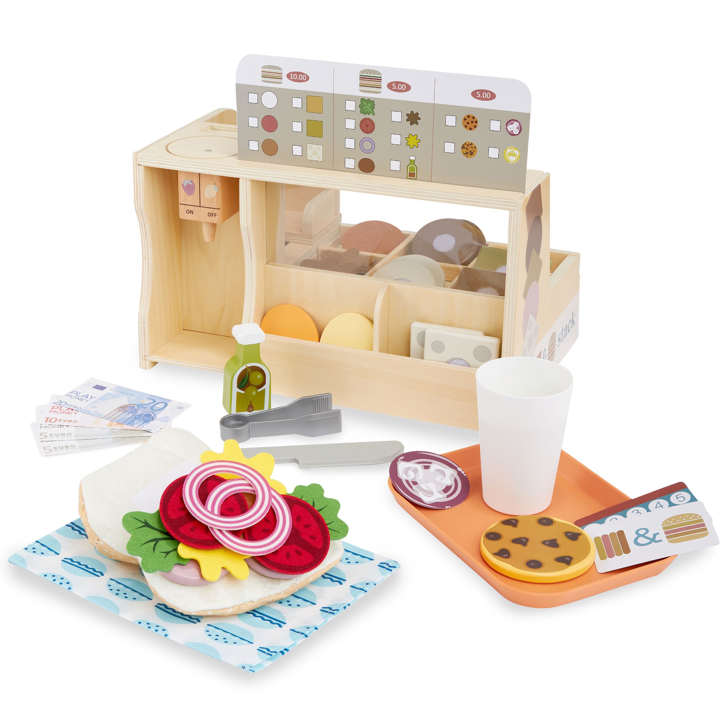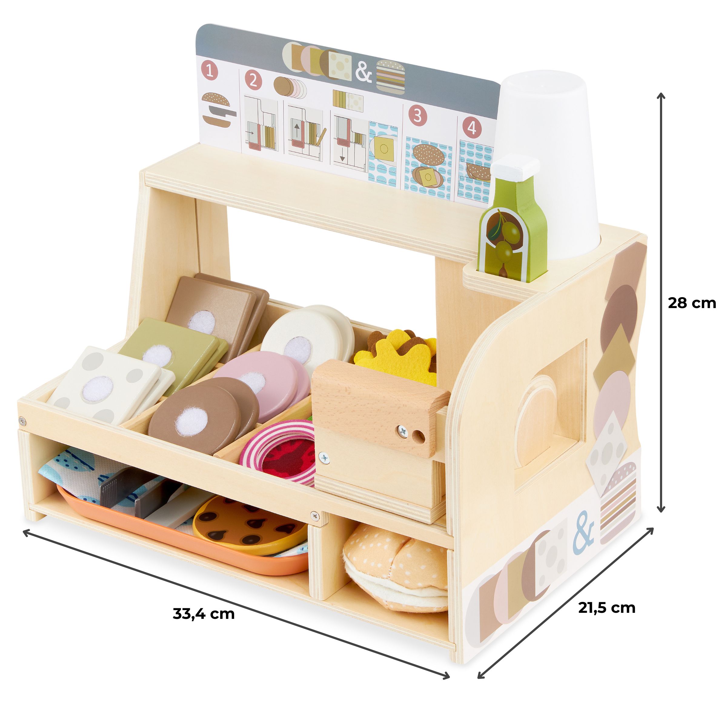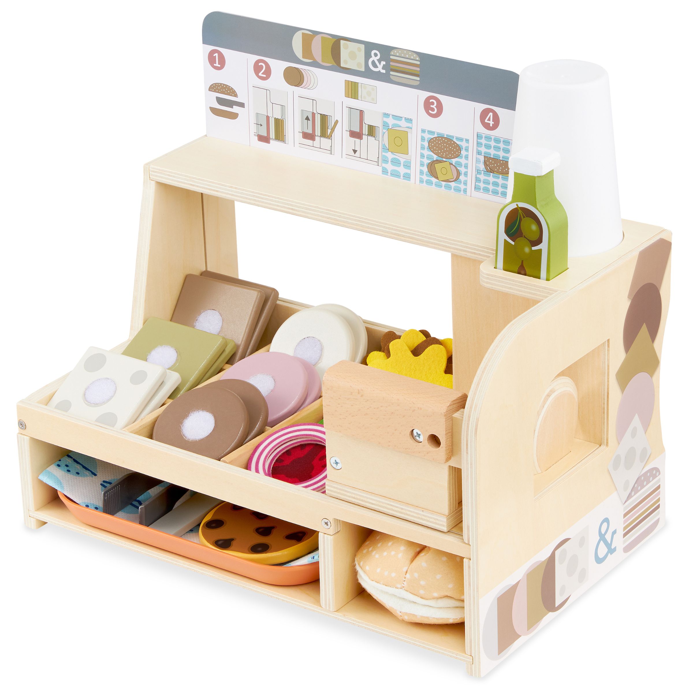 Zahvaljujući igrački opremljenoj brojnim dodacima, vaše će dijete moći igrati ulogu prodavača svježih i šarenih sendviča. Sendvič bar, izrađen od izdržljivog drva, sadrži sve što je potrebno za njihovu pripremu. Prava atrakcija je pomični rezač koji djetetu omogućuje "rezanje" sira ili mesa. Sastojci sendviča imaju čičak , tako da možete jednostavno sastaviti ukusan sendvič. Sve što trebate je piće i ukusan obrok je spreman!