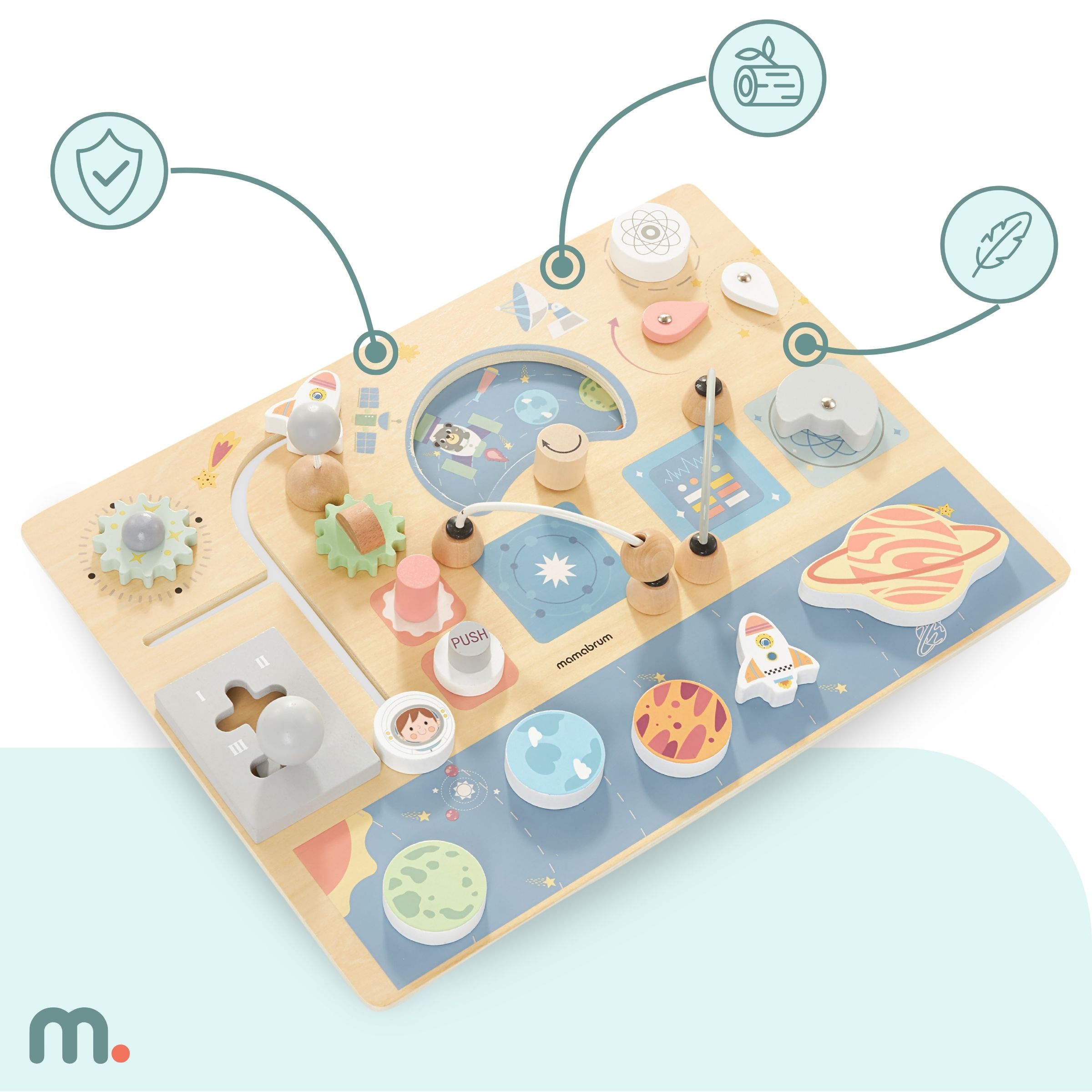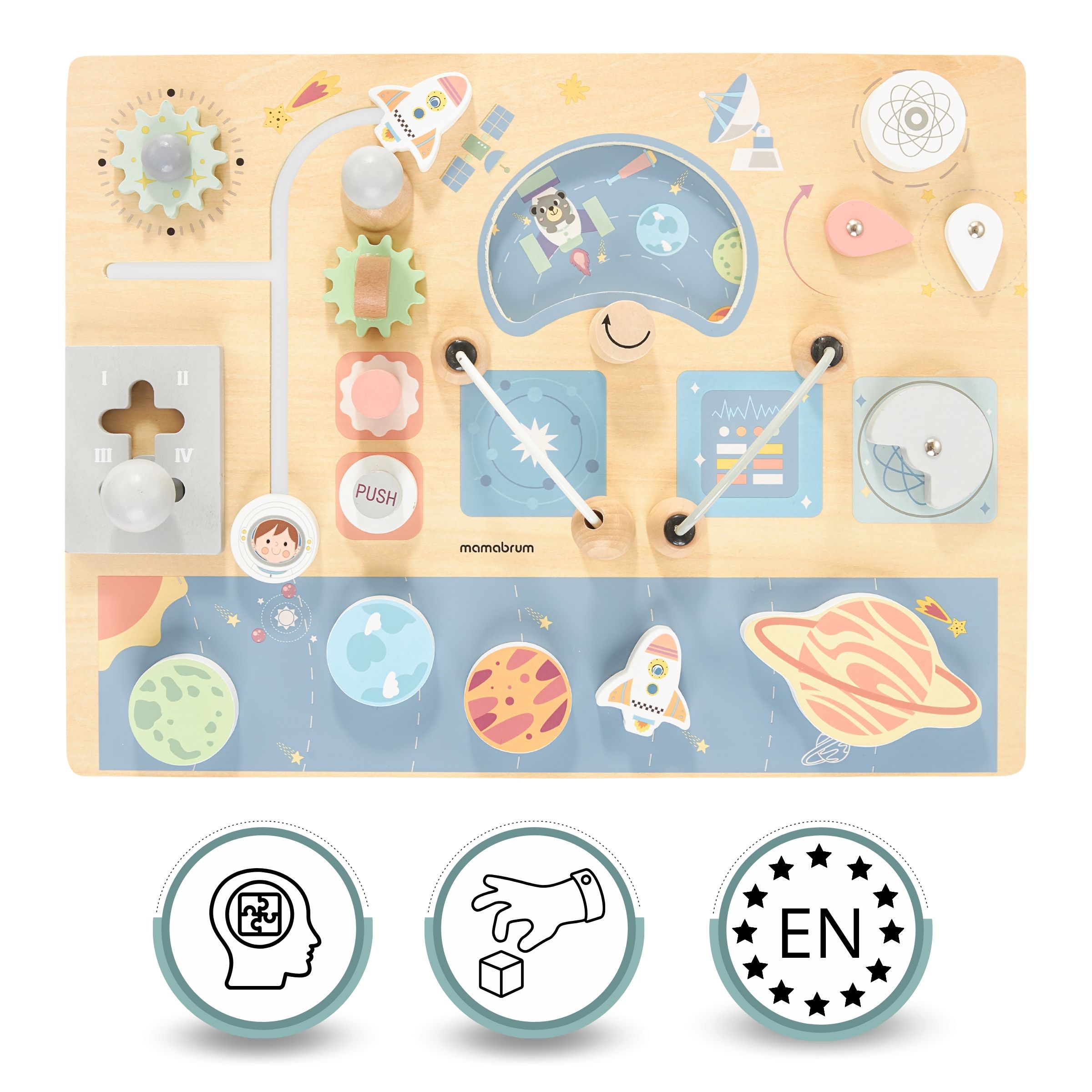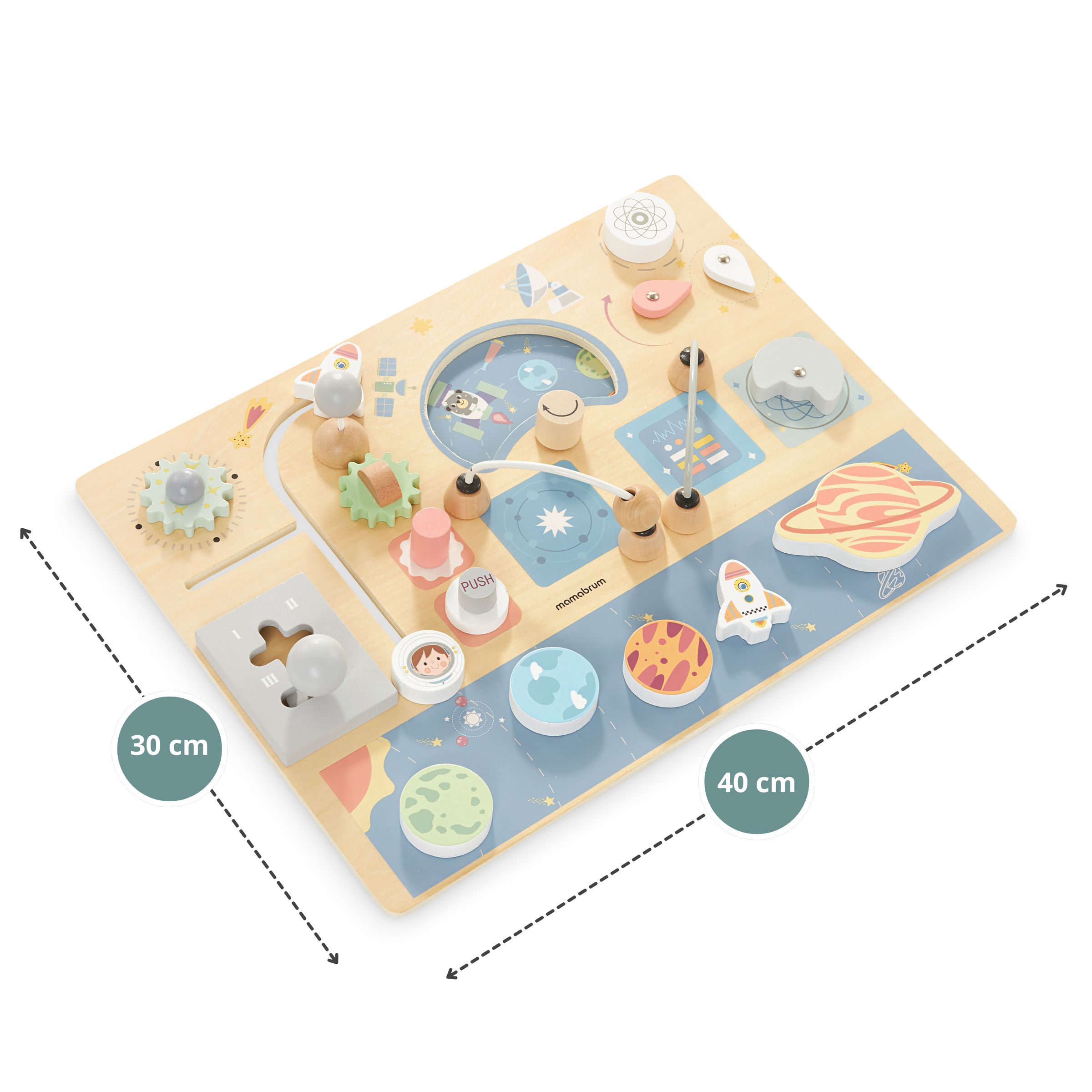 Drvena manipulativna ploča Cosmos potaknut će dječju maštu , pretvarajući mališana u avanturističkog astronauta koji svoju raketu priprema za polijetanje. Brojne dostupne aktivnosti osiguravaju da Vašem djetetu igračka neće dugo dosaditi. Ovo je izvrsna potpora kognitivnom i motoričkom razvoju vašeg djeteta i fantastičan dar za njega!