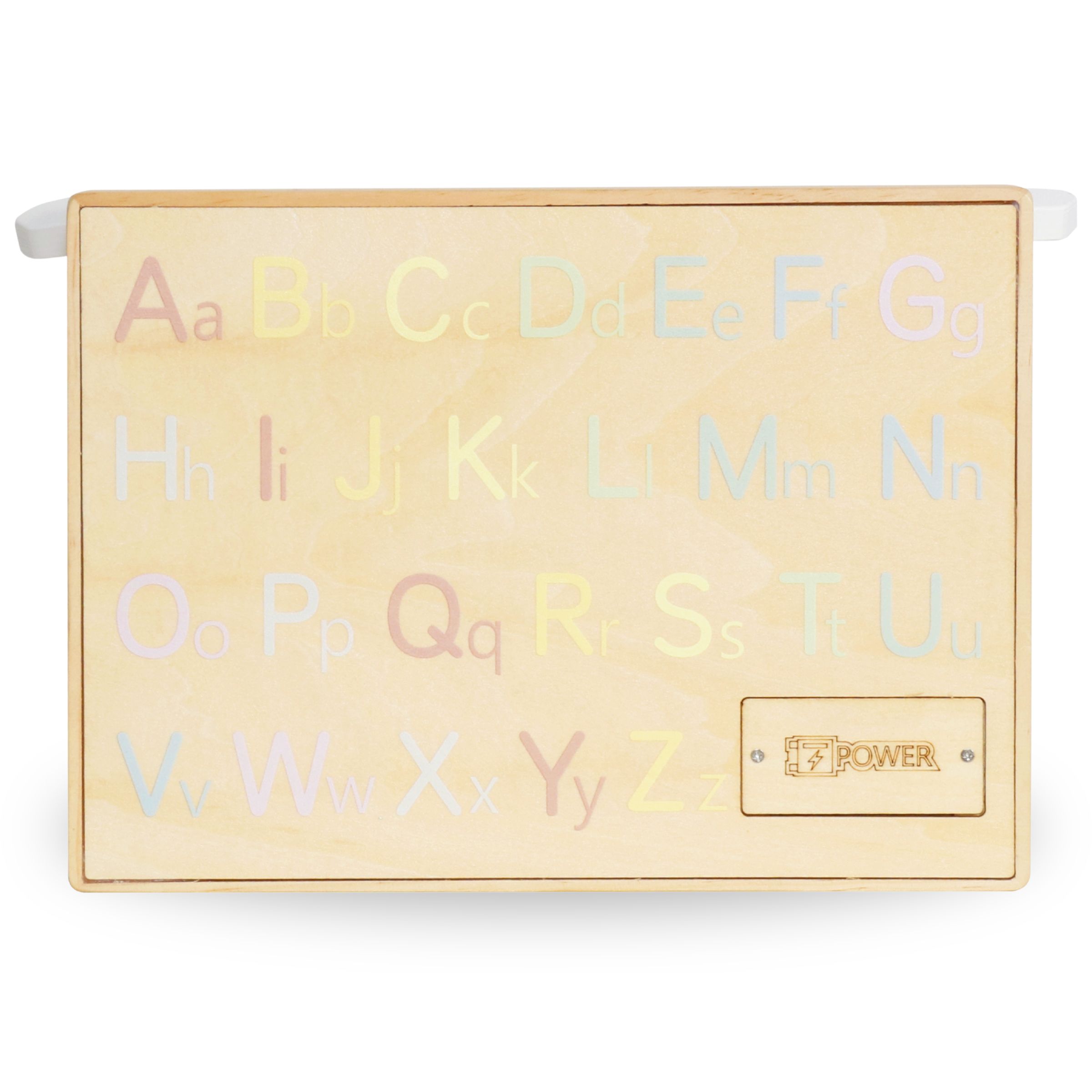 Dizajnirana u duhu Montessorija, ova igračka očarava svojom jednostavnošću i funkcionalnošću . Brojni pokretni dijelovi potiču interakciju i pružaju dugotrajnu zabavu. Međutim, drvena ploča nije samo za zabavu; ona također uči abecedu . Na poleđini se nalazi 26 šarenih slova .