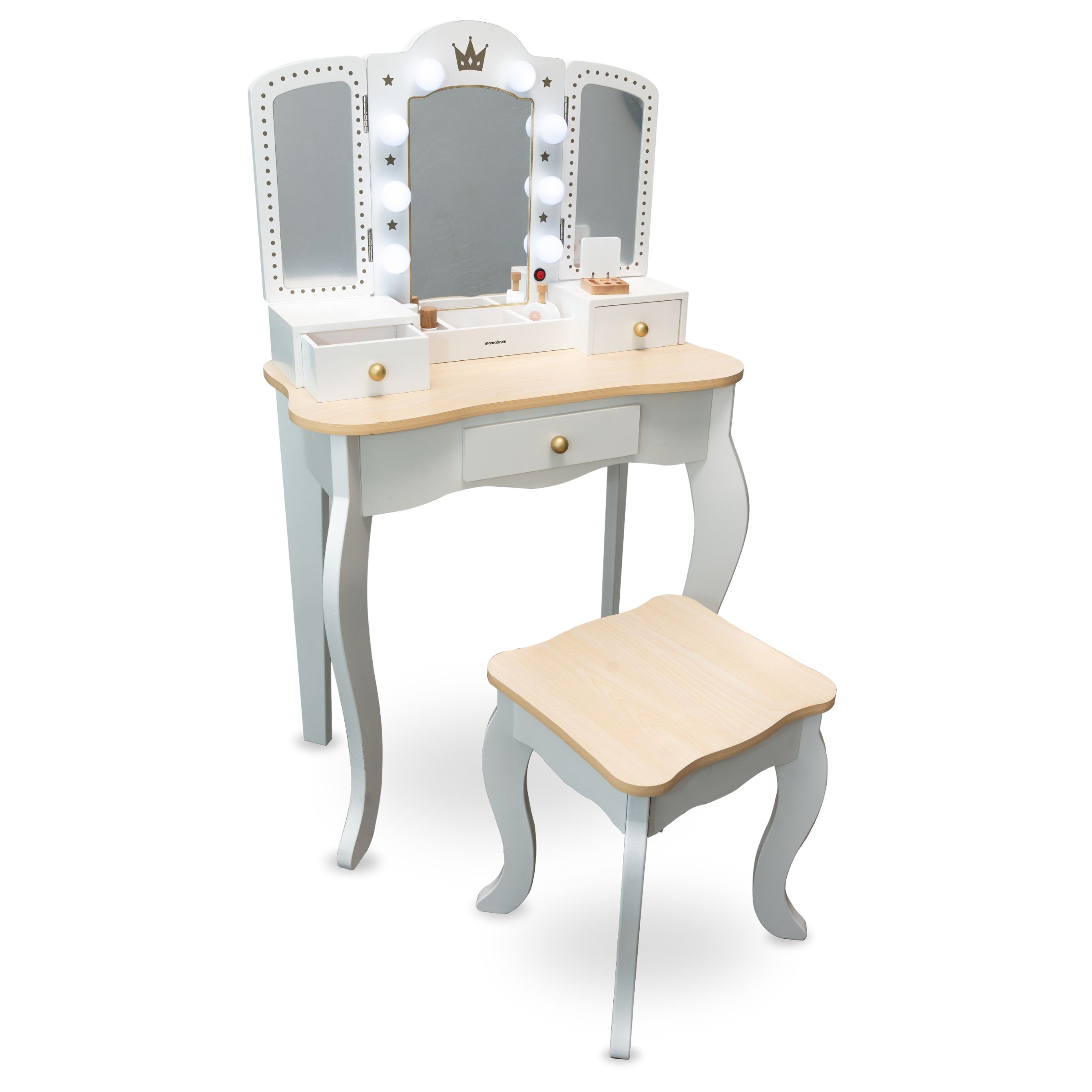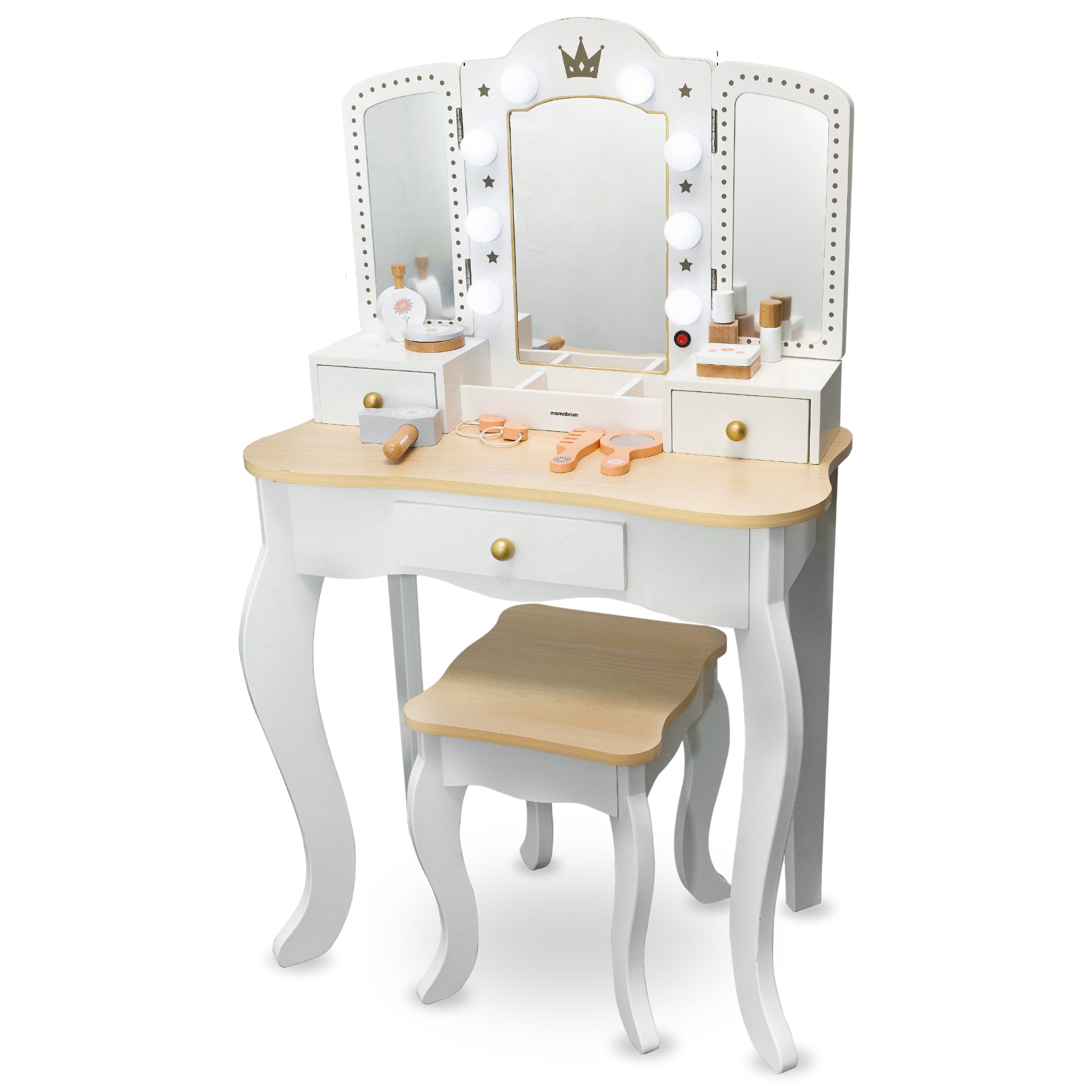 Osam LED žarulja pruža atmosferično, meko osvjetljenje. Ogledalo se može ukloniti, pretvarajući toaletni stolić u mali radni stol. Da biste vidjeli svoje lice iz drugog kuta, jednostavno podesite bočna ogledala. Drveni toaletni stolić jedinstvena je ideja za poklon za vašeg mališana!