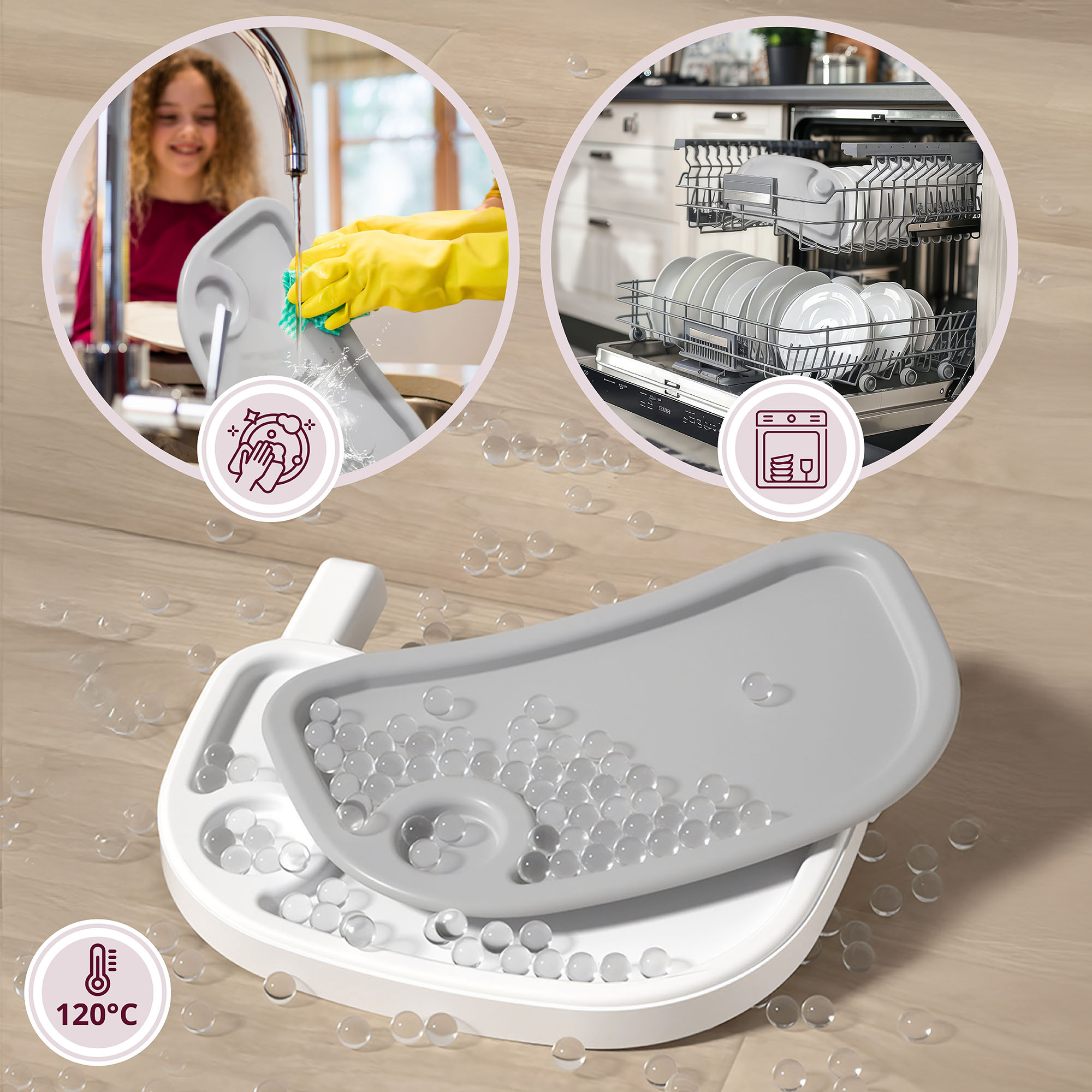 - Dvostruki pladanj s udubljenjem za šalice - gornji dio se lako može ukloniti i oprati, ostavljajući vašem djetetu čistu površinu za igru