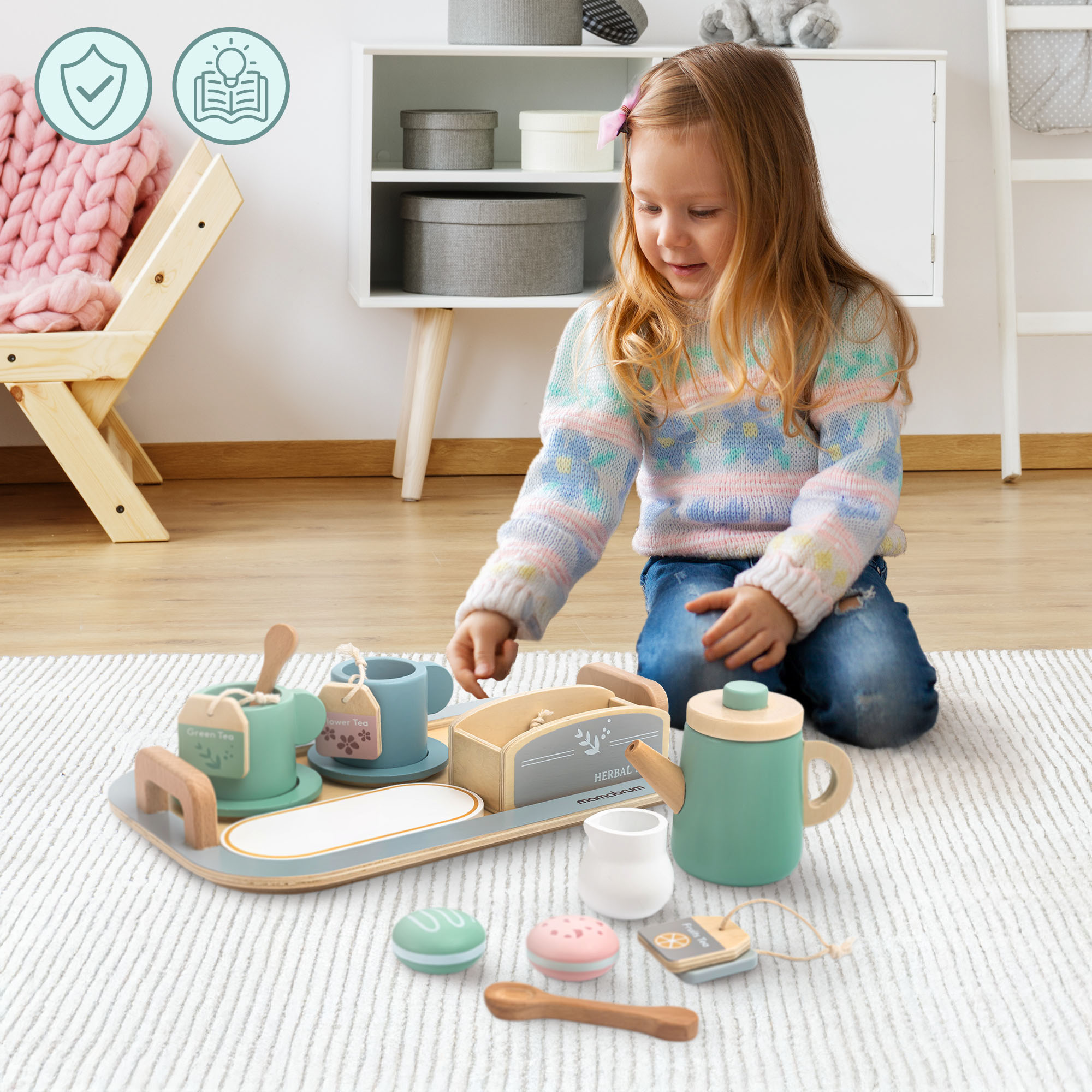Vrijeme je za početak posebne zabave! Jednostavno rasklopite šareni set, napunite čajnik i pozovite svoje voljene da se pridruže zabavi. Ovaj drveni set za čaj savršen je način za razvoj dječje mašte i pružanje svakodnevne doze radosti.