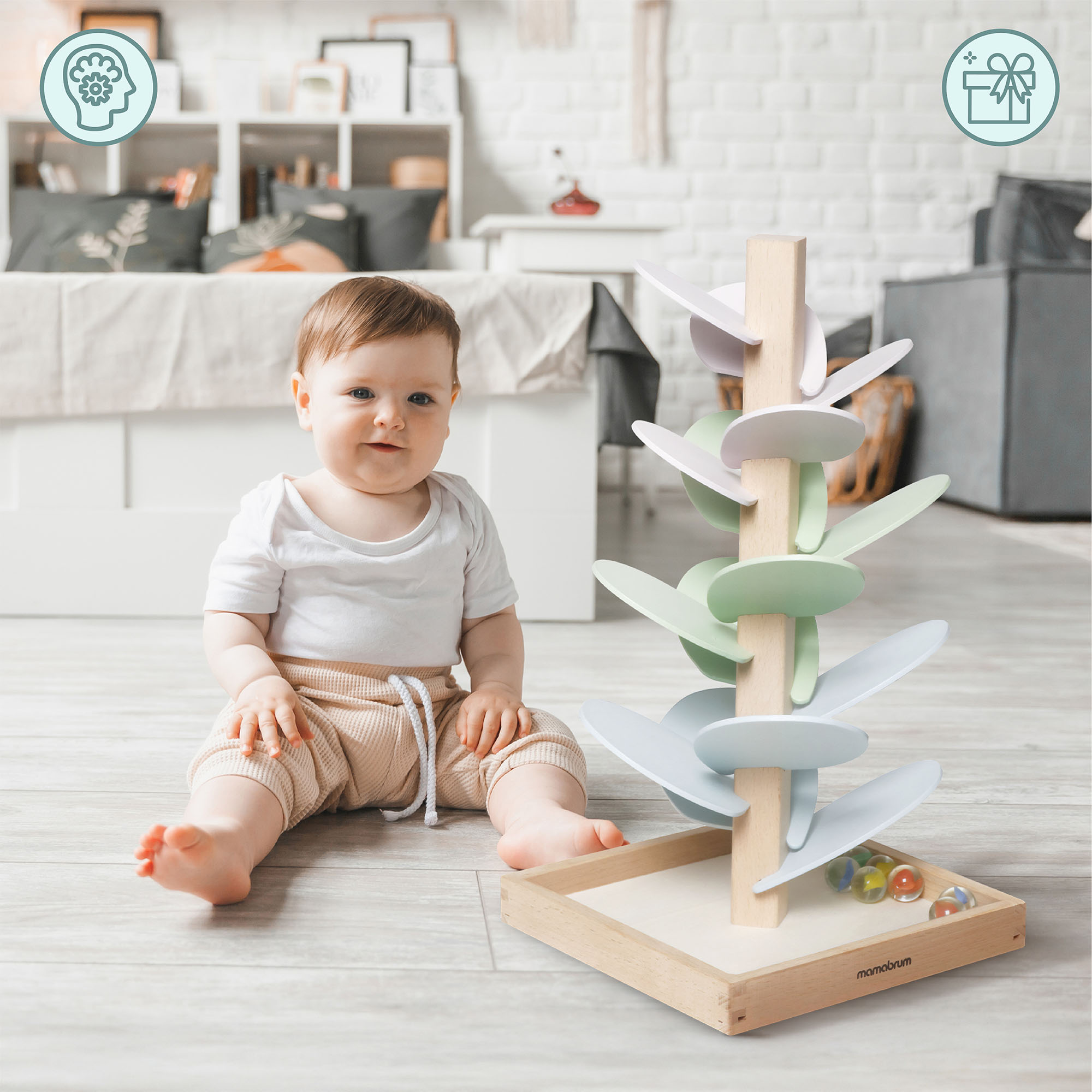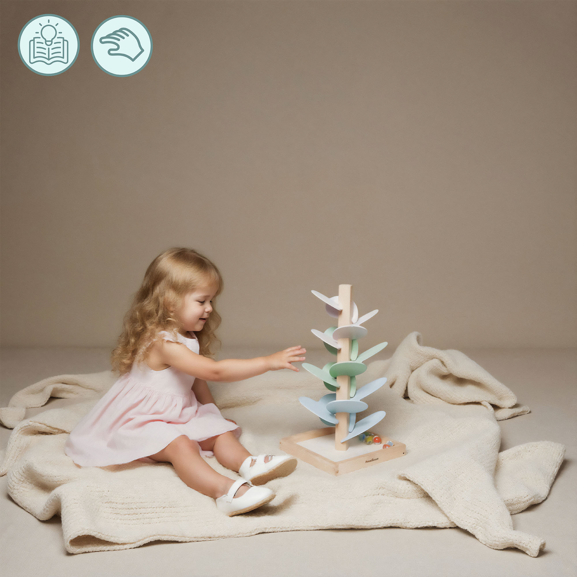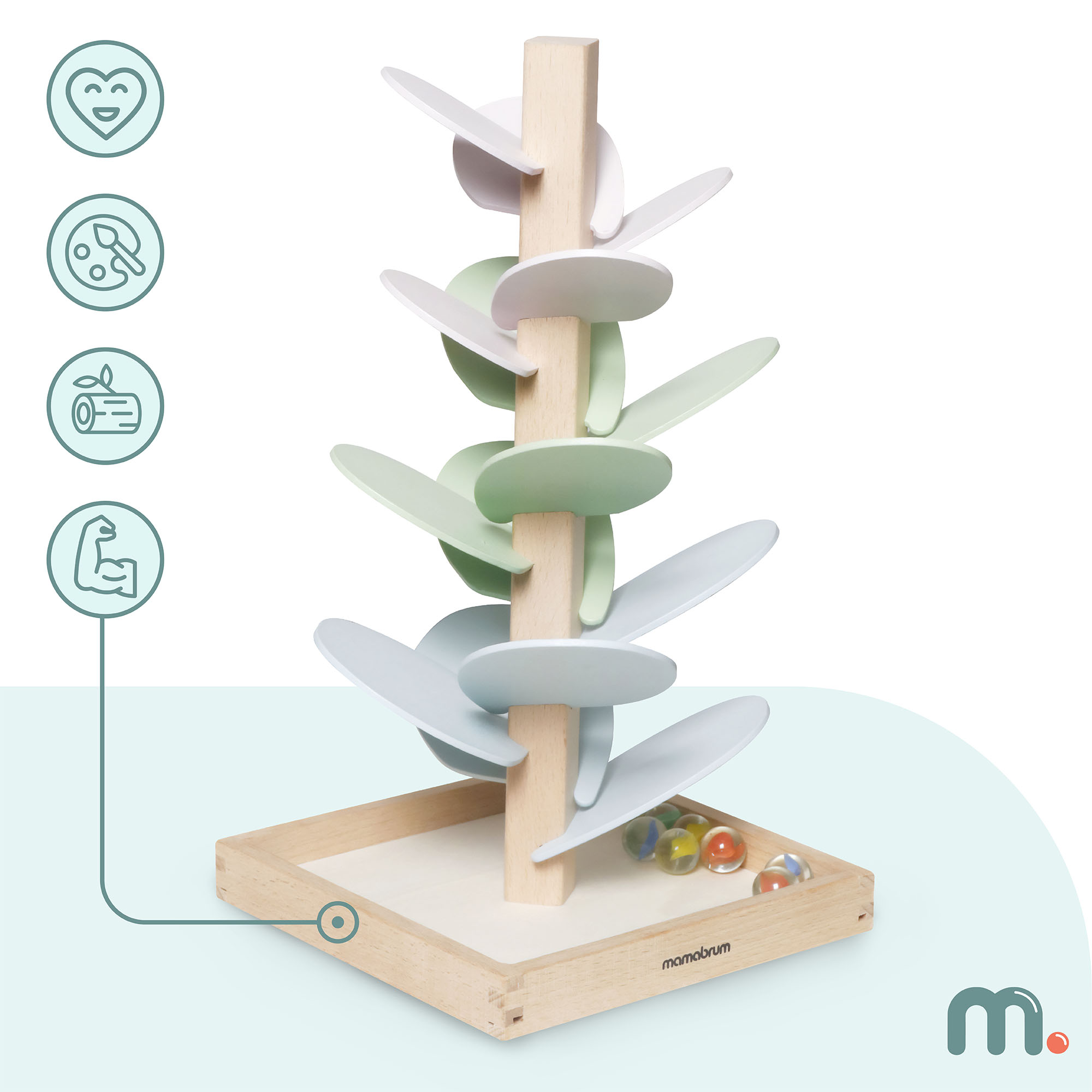 Ovo drveno drvce postat će jedinstven ukras za dječju sobu, donoseći mir i dašak čarolije . Pastelni listovi oduševljavaju svojom nježnom teksturom, dok prozirne kuglice sa šarenim središtem dodaju jedinstven vizualni efekt. Ova igračka uči strpljenju, koncentraciji i koordinaciji , a ujedno ima umirujući učinak, podržavajući djetetov mir. To je savršen poklon koji kombinira razvoj s kreativnom i radosnom igrom.