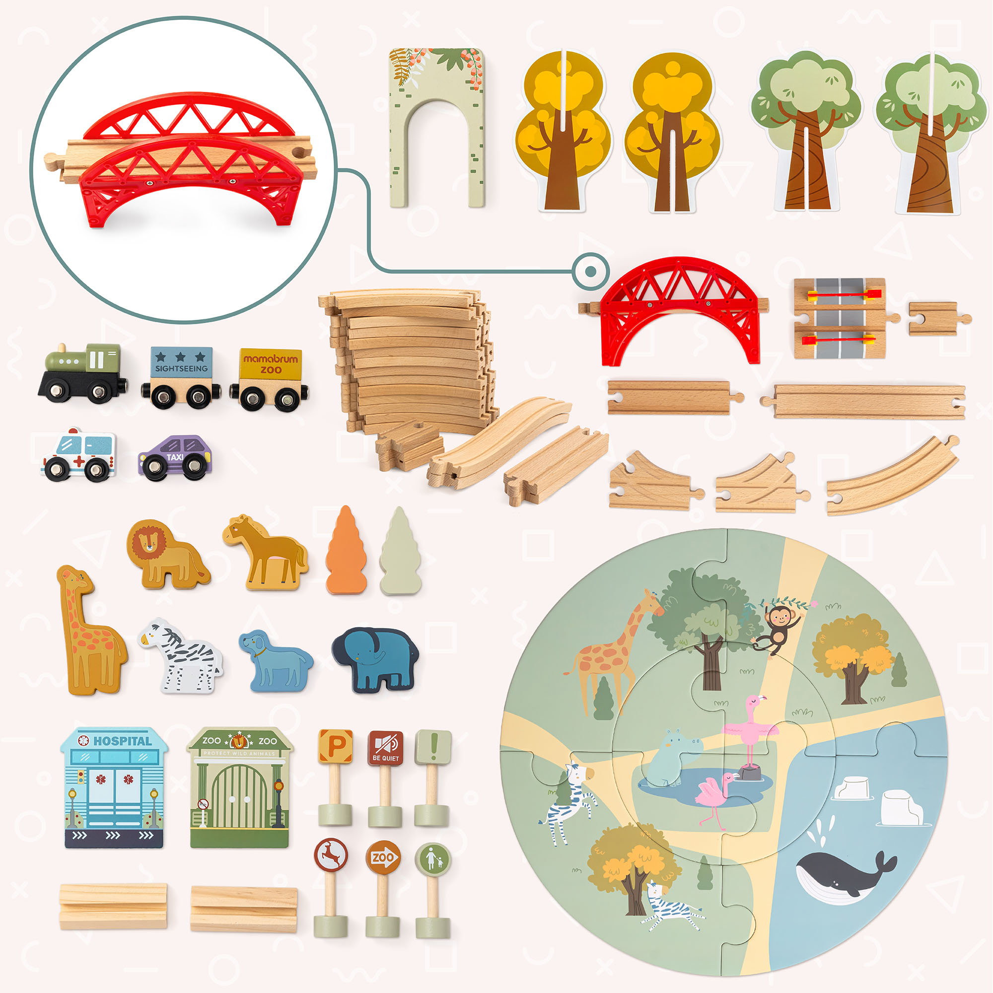 Središnja točka seta je upečatljivi crveni most i drvena vrata zoološkog vrta , koji privlače dječju pažnju i stvaraju brojne mogućnosti za igru. Vlak sa svojim vagonima prelazi preko mosta i stiže do vrata zoološkog vrta, gdje ih čeka čarobni svijet safarija . Ovo je izvrsna prilika za učenje društvenih uloga i razvoj kreativnosti – djeca mogu stvarati priče o posjetu zoološkom vrtu ili brizi za životinje.