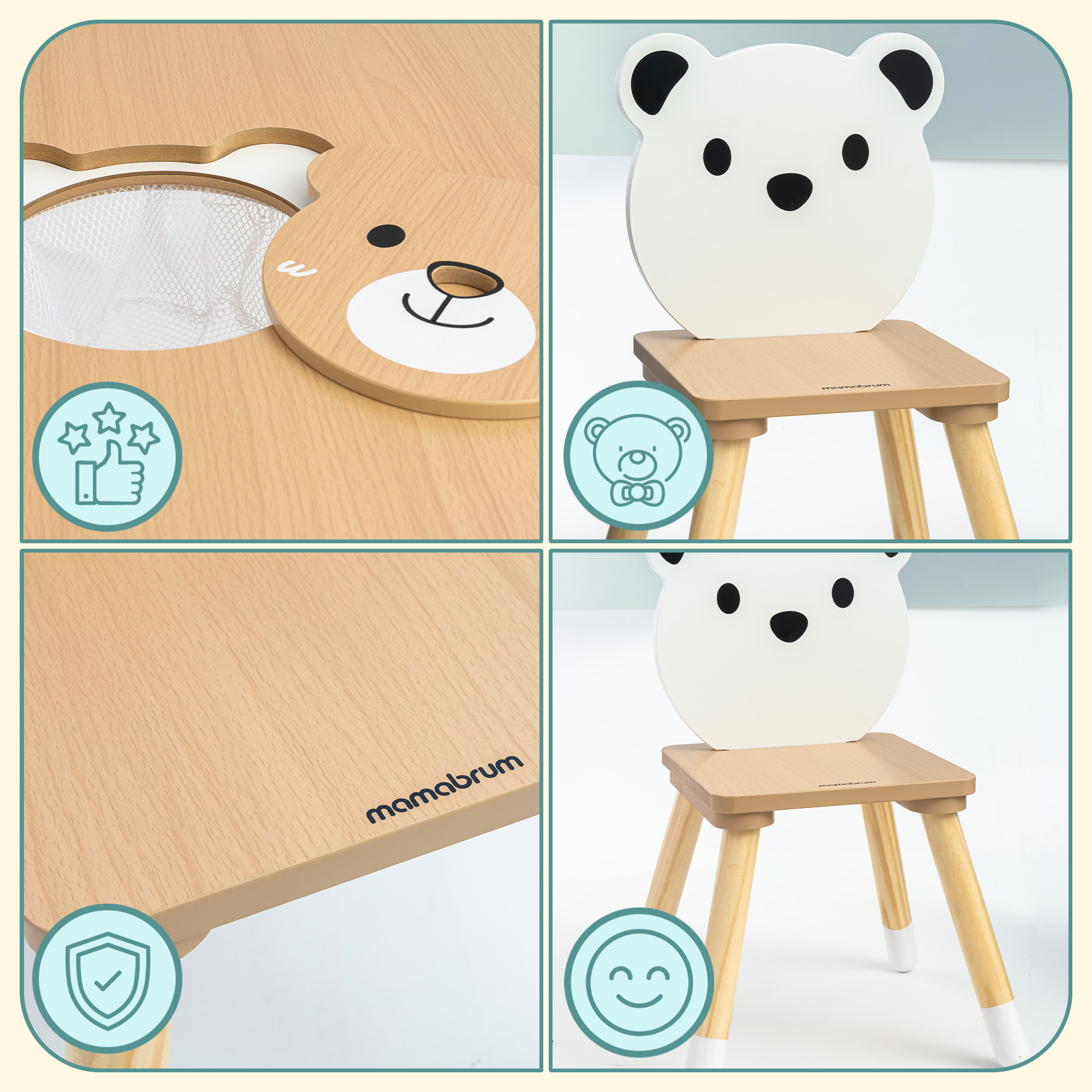 Set nije samo vizualno ugodan, već i razvija dječju samostalnost. Stol s prostorom za pohranu pomaže u održavanju urednosti , dok stolice s naslonima u obliku plišanih medvjedića potiču zajedničko provođenje vremena za stolom. Zahvaljujući odgovarajućoj visini sjedala (26,5 cm), namještaj je udoban i siguran za mlade korisnike.