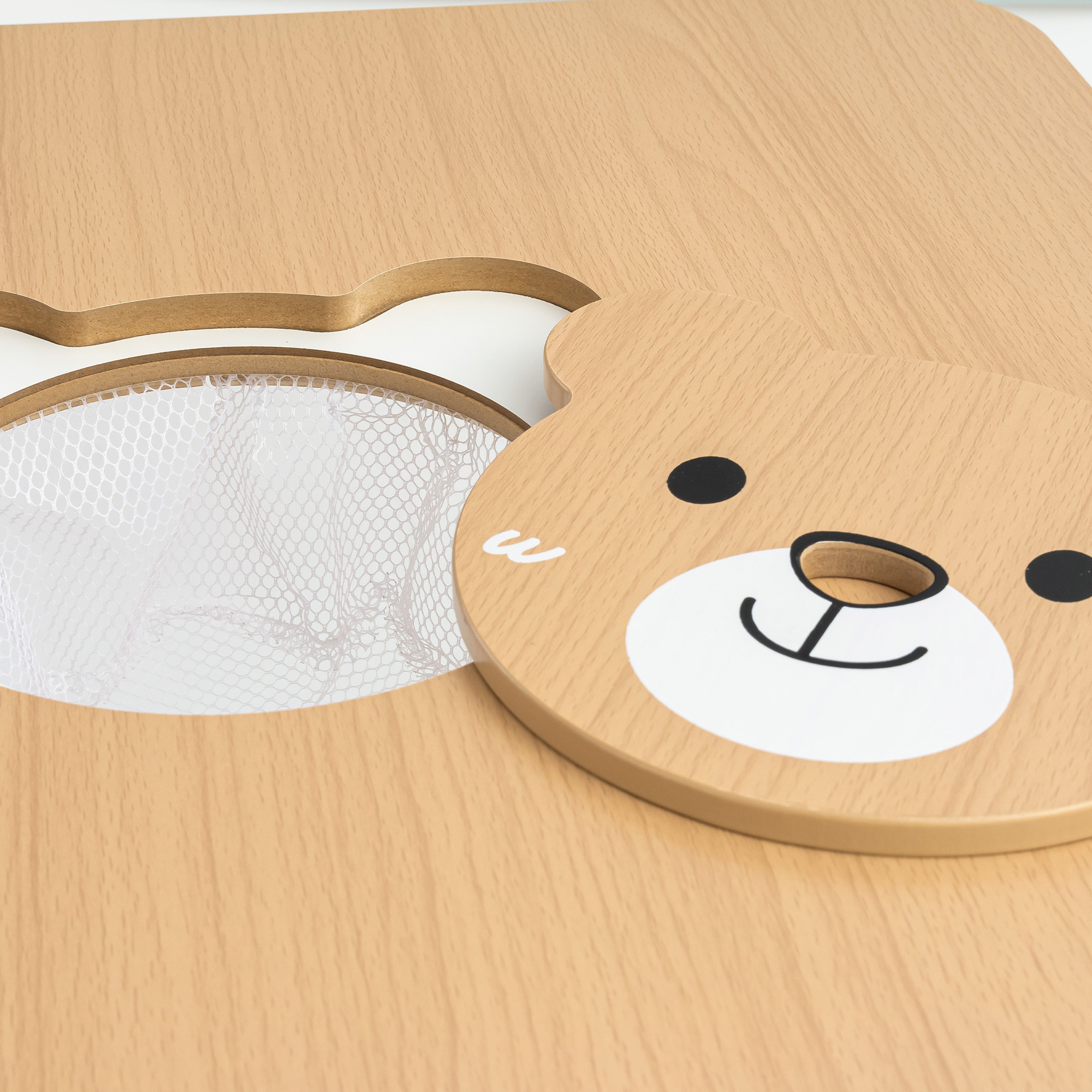 Središnji pretinac za pohranu izrađen od fleksibilne mreže pravi je vrhunac ovog stola – pametno skriven ispod ploče stola , omogućuje vam brzo spremanje bojica, kockica ili omiljenih igračaka, a istovremeno održava ploču stola urednom. Pretinac ima praktičan poklopac u obliku medvjedića koji, kada je zatvoren, stvara savršeno glatku površinu . Djeca imaju jednostavan pristup svim svojim potrepštinama bez ustajanja od stola. To nije samo praktično, već i užitak za mališane – svaki put kada posegnu u "tajni džep" ispod ploče stola, običnu igru pretvara u uzbudljivu avanturu!
