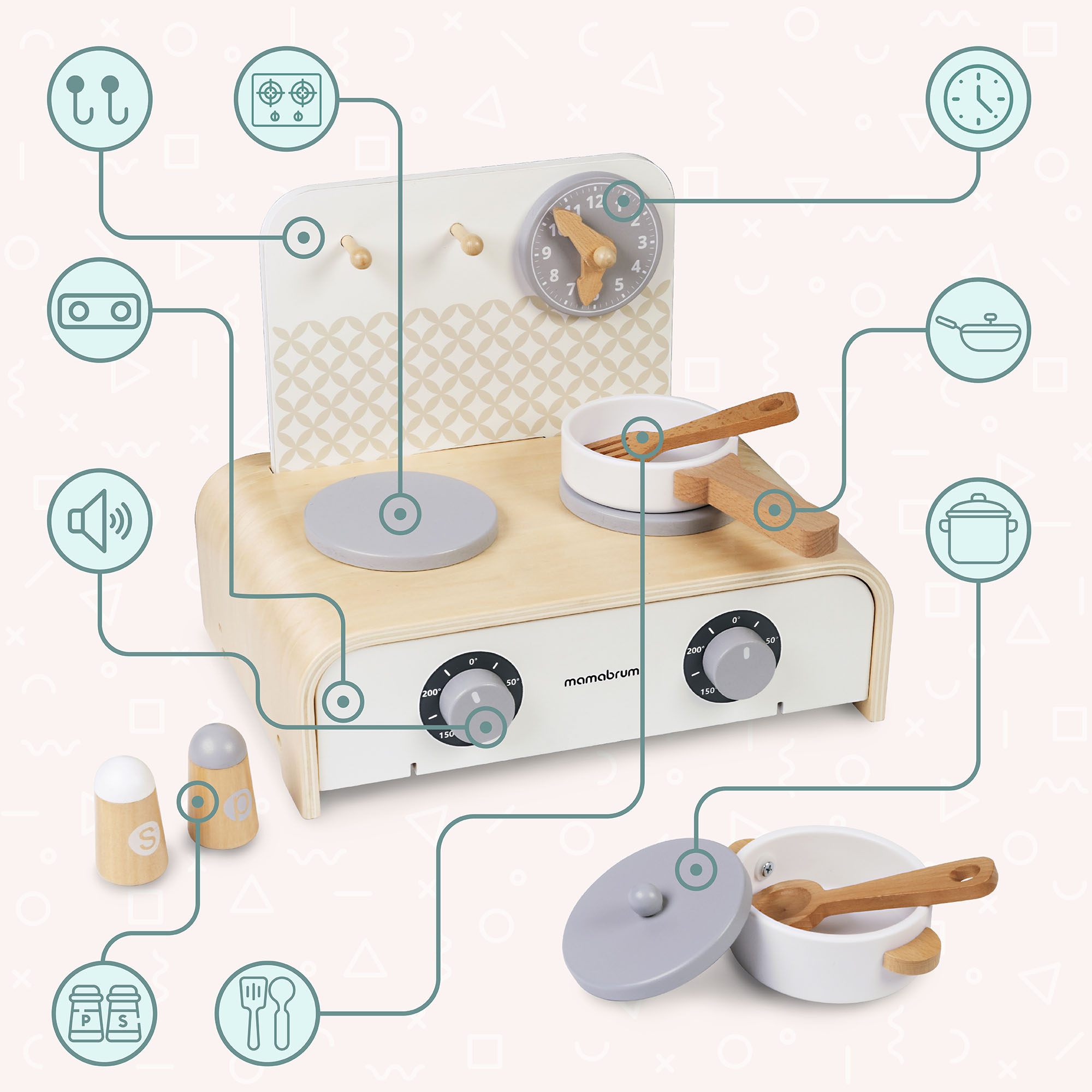 Ova mini kuhinja ima sve što je malom kuharu potrebno za početak njegove kulinarske avanture. Set uključuje lonce, tavu, soljenku i paprenku te drveni pribor za jelo , što im omogućuje da rekreiraju svakodnevne kuhinjske situacije. Okretanjem klikajućih gumba, mjerenjem vremena na satu i "kuhanjem" na dva plamenika djeca mogu oponašati odrasle i stvarati vlastite recepte, dodajući realizam i uzbuđenje iskustvu igre.