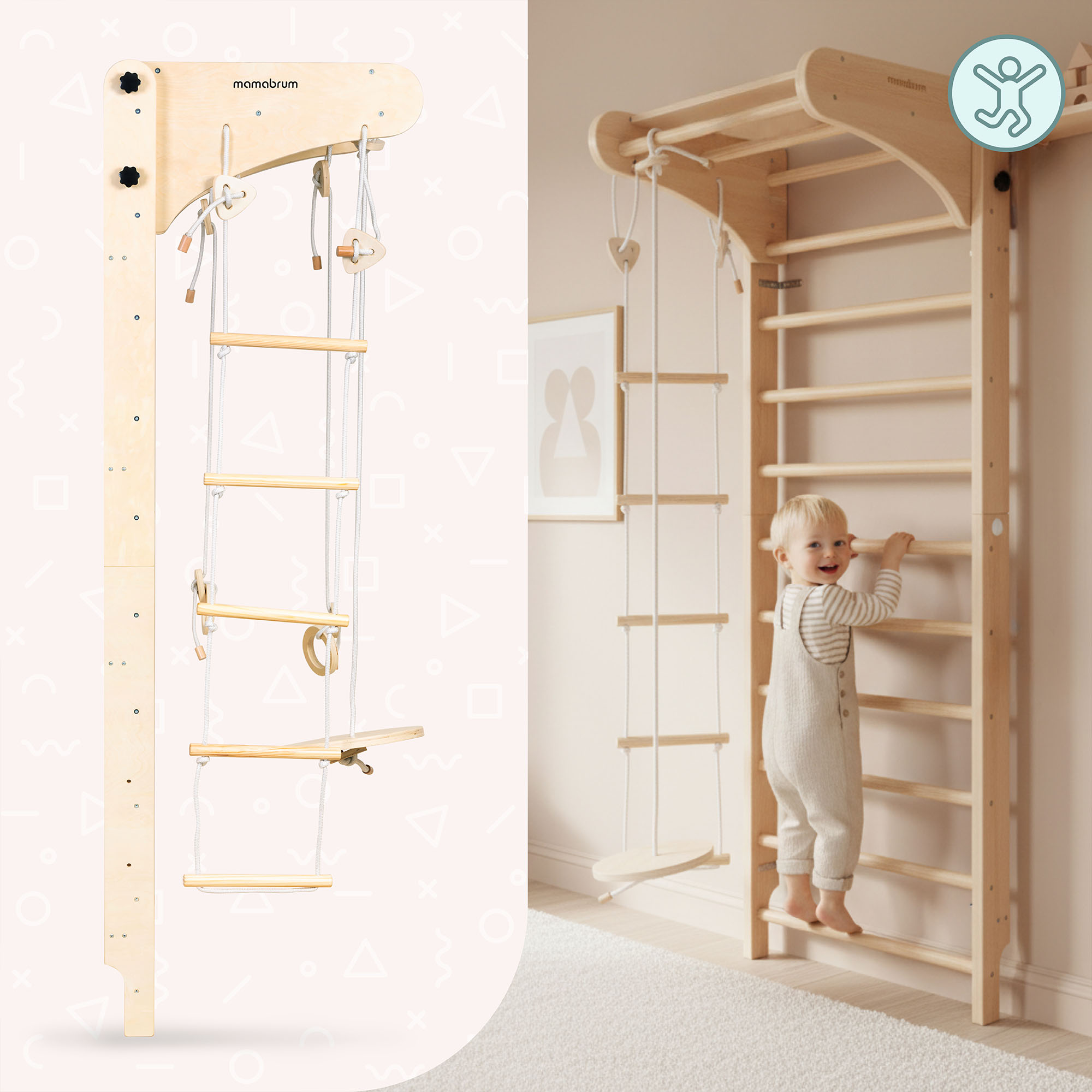 Ljestve uključuju cijeli set dodatne opreme – ljuljačka, gimnastički prstenovi i ljestve su standardni, a ne opcionalni dodaci! Omogućuju djeci ljuljanje, penjanje, vježbanje ravnoteže, podizanje i isprobavanje prvih akrobacija. Same ljestve postaju izvrsno mjesto za svakodnevnu vježbu. To je svestran centar za kretanje koji podržava razvoj koordinacije, snage i agilnosti, a istovremeno djeci pruža radost i slobodu istraživanja novih aktivnosti. Potpuno su sigurne, stabilne i dizajnirane za najmlađe , pružajući roditeljima mir, a djeci radost, slobodu i dnevnu dozu zdrave aktivnosti.