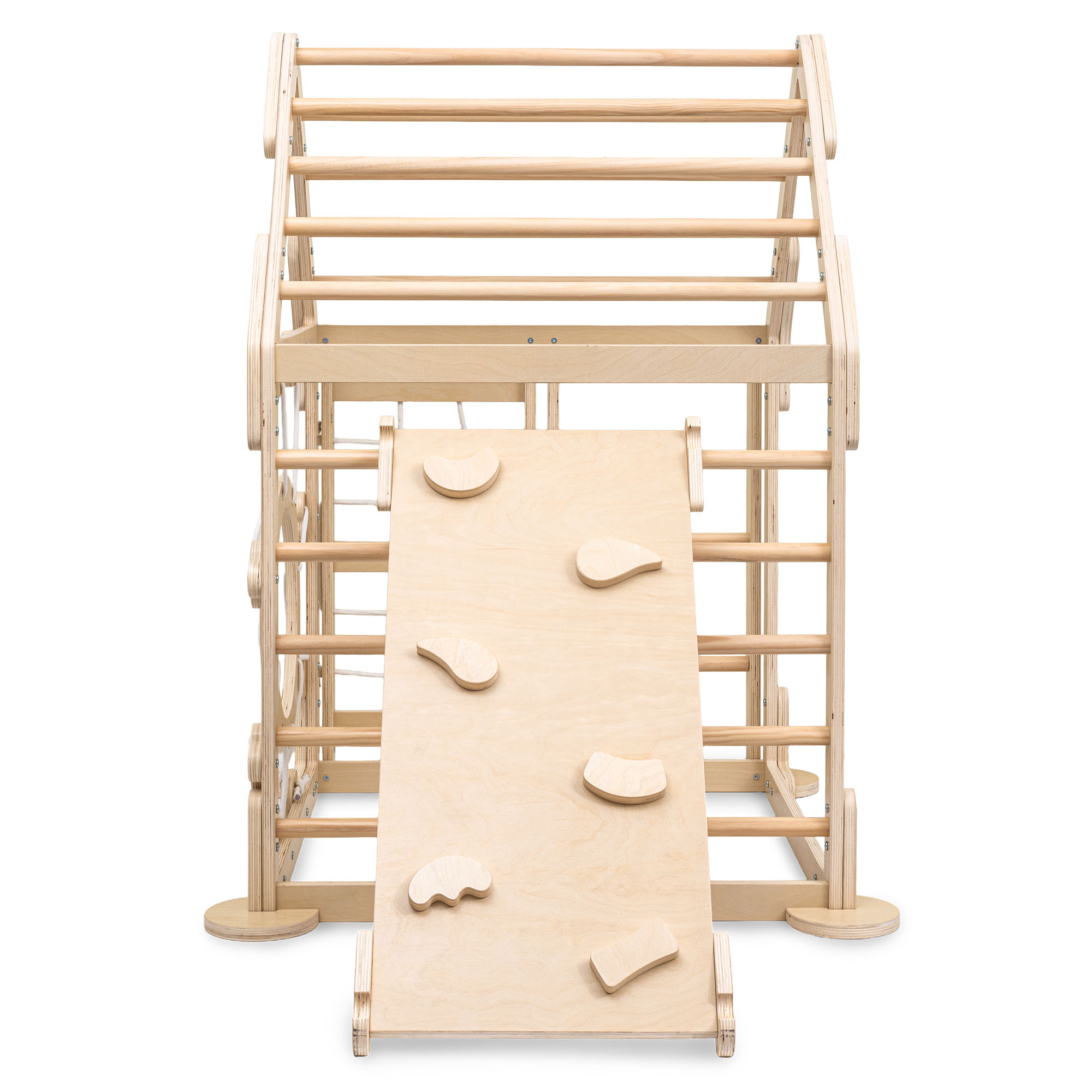 Pružite svom djetetu pravo igralište... upravo u njegovoj sobi! Drvena kuća za penjanje Mamabrum kombinira gimnastičke ljestve, zid za penjanje, mrežu, kružni otvor za penjanje i krov za penjanje. Njegova svestranost čini ga centrom aktivnosti koji potiče kretanje, razvija fizičku kondiciju i pruža sate zabave.