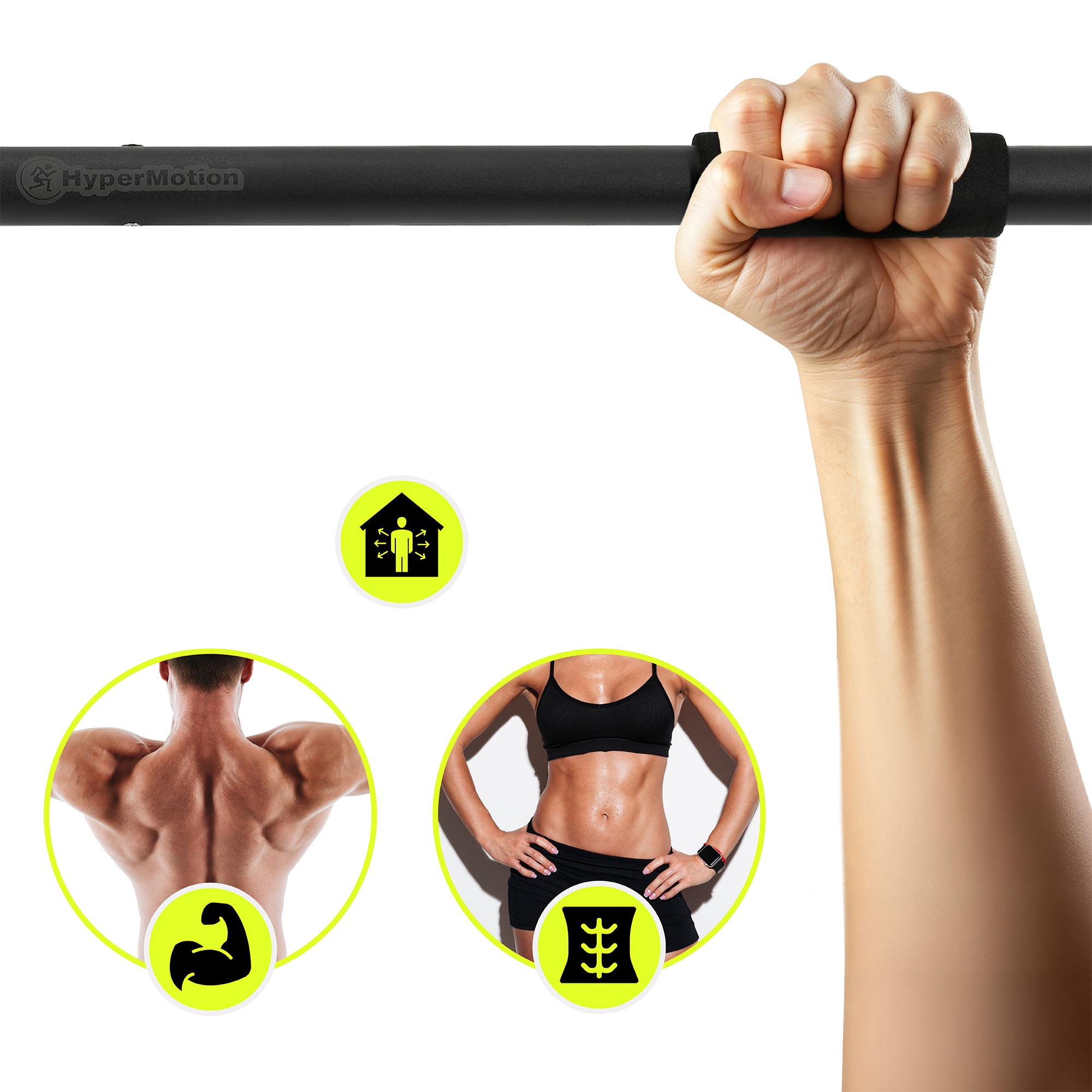 HyperMotion šipka za zgibove odličan je način za razvoj snage i kondicije bez napuštanja doma. S rasponom podešavanja duljine od 80-130 cm, lako se prilagođava većini okvira vrata, a nakon što se postavi željena širina , mehanizam potpornja drži šipku stabilnom u odabranom položaju tijekom vježbanja. Čvrsta čelična konstrukcija pruža pouzdanu potporu čak i pod velikim opterećenjima, omogućujući udobno i sigurno izvođenje raznih vježbi. Neklizajuće ručke izrađene od guste NBR pjene poboljšavaju kontrolu hvata i smanjuju rizik od ogrebotina, a zahvaljujući niskoj apsorpciji vlage, održavaju hvat čak i tijekom intenzivnog treninga, čineći vježbe učinkovitijima i udobnijima.
