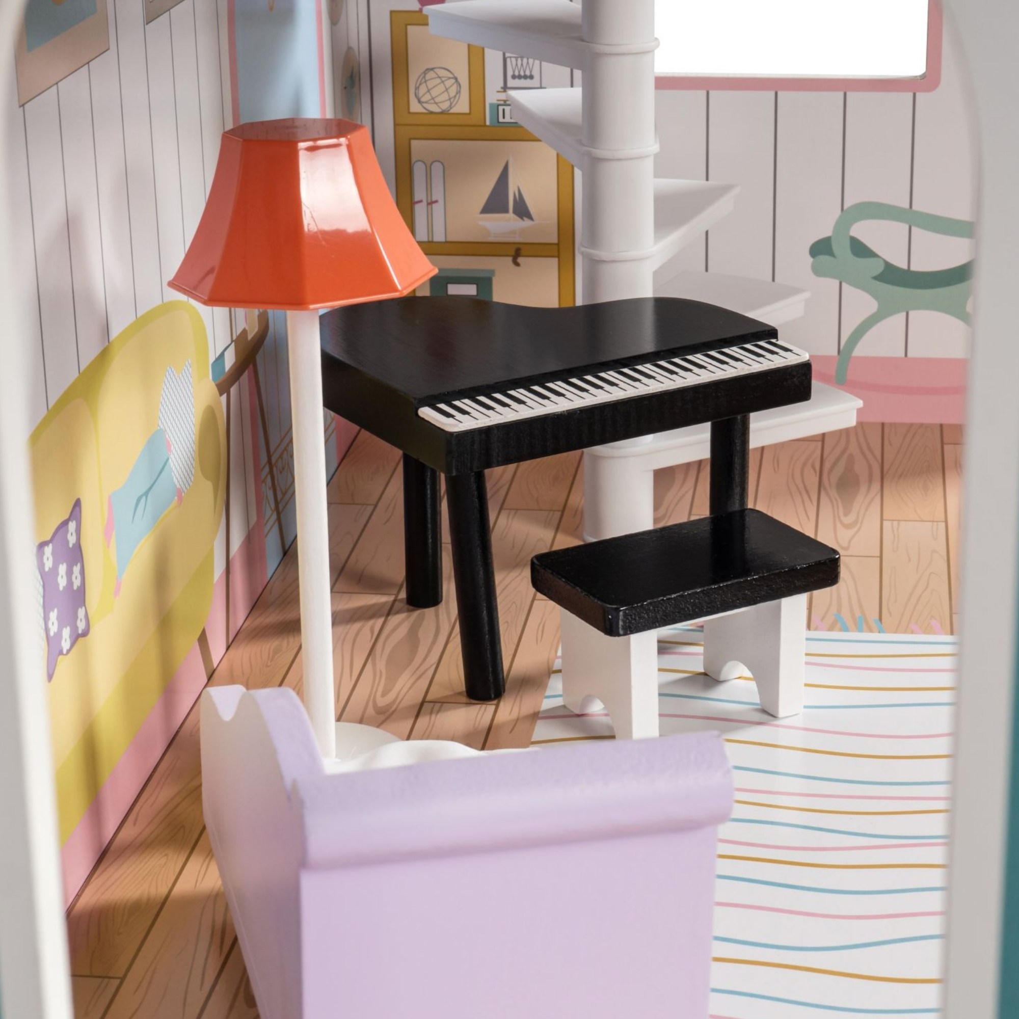 Kuća ima 3 nezavisne razine, svaka s različitim sobama. Dodatno, igračka je opremljena prekrasnom terasom i vrtom. Svaka djevojčica sanja o tako prekrasnom domu za svoje lutke!