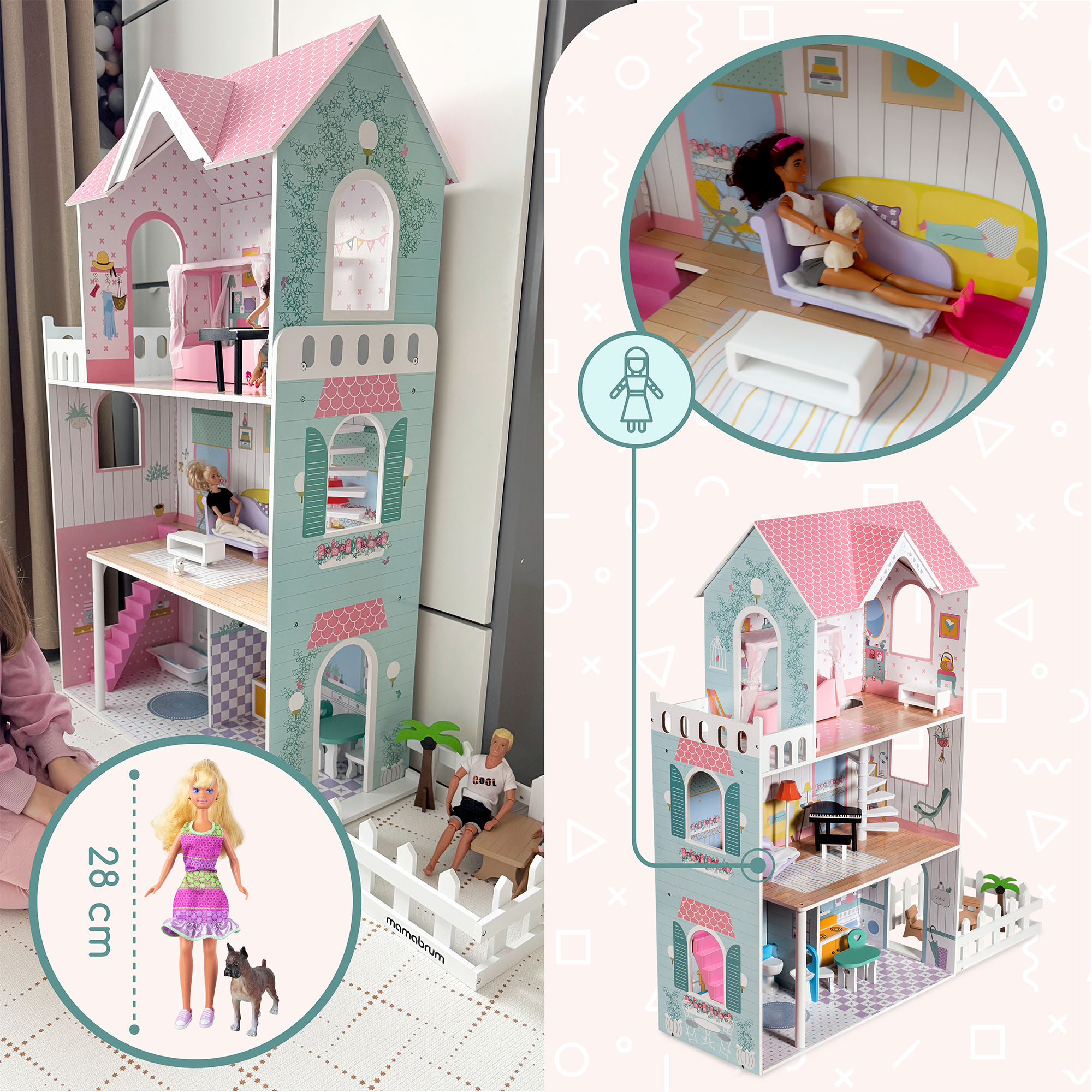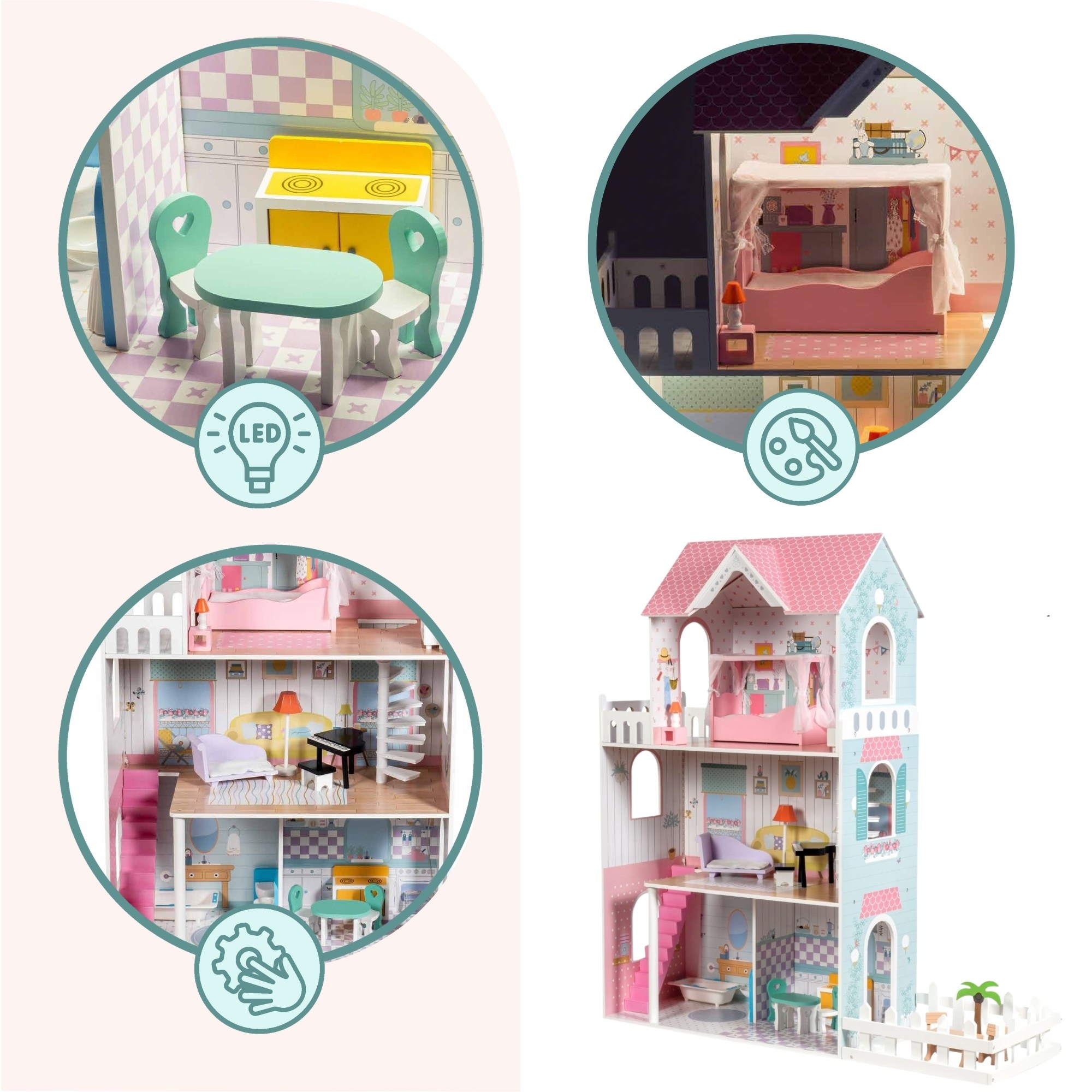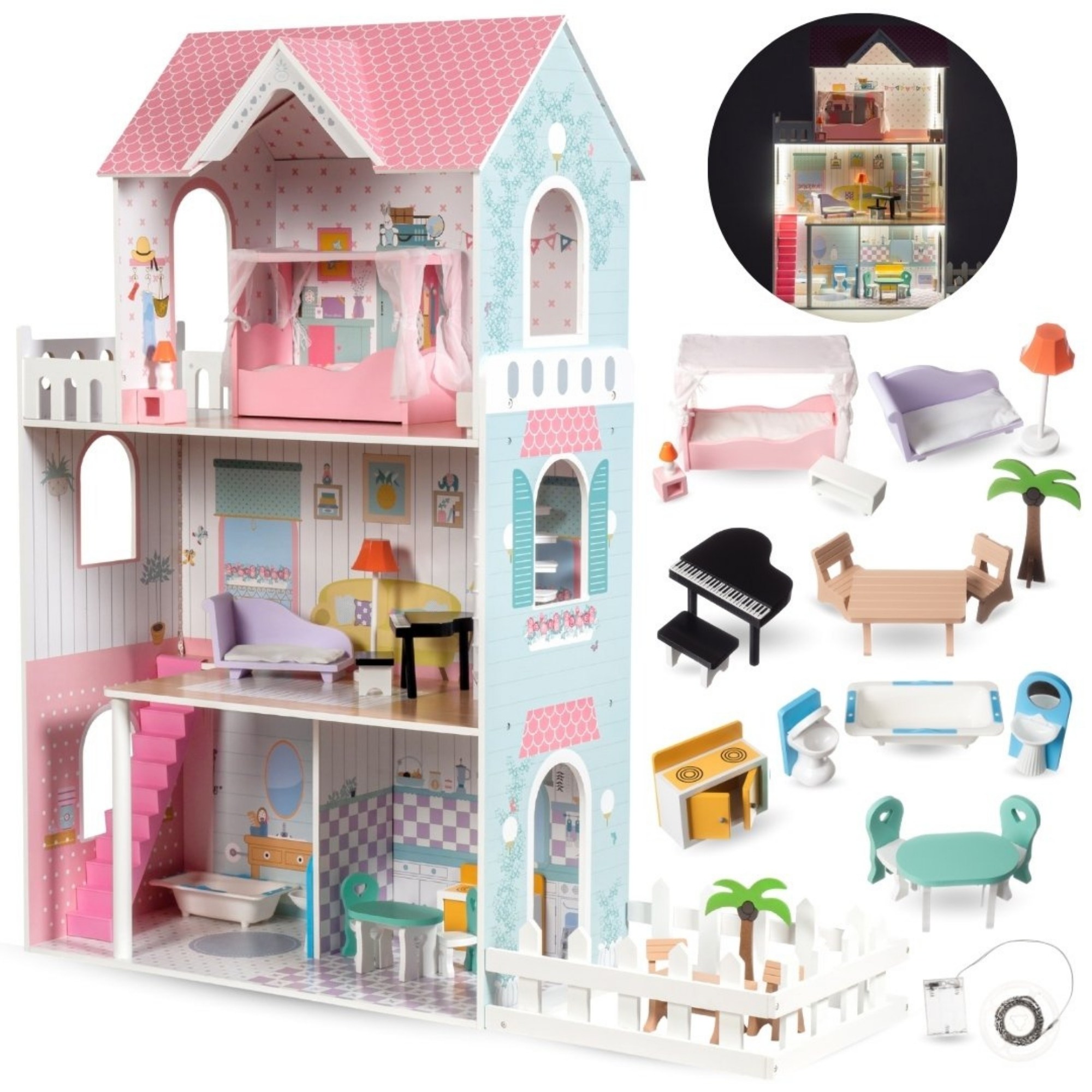 Najveća XXL drvena kućica za lutke - do 123 cm - LED osvijetljena - terasa, pribor, vrt.