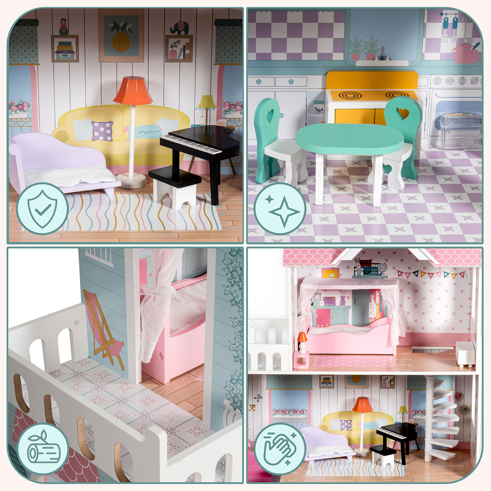 Svi elementi izrađeni su od visokokvalitetnog drva sigurnog za djecu. Kućica se lako sprema i čisti - samo je prebrišite vlažnom krpom.