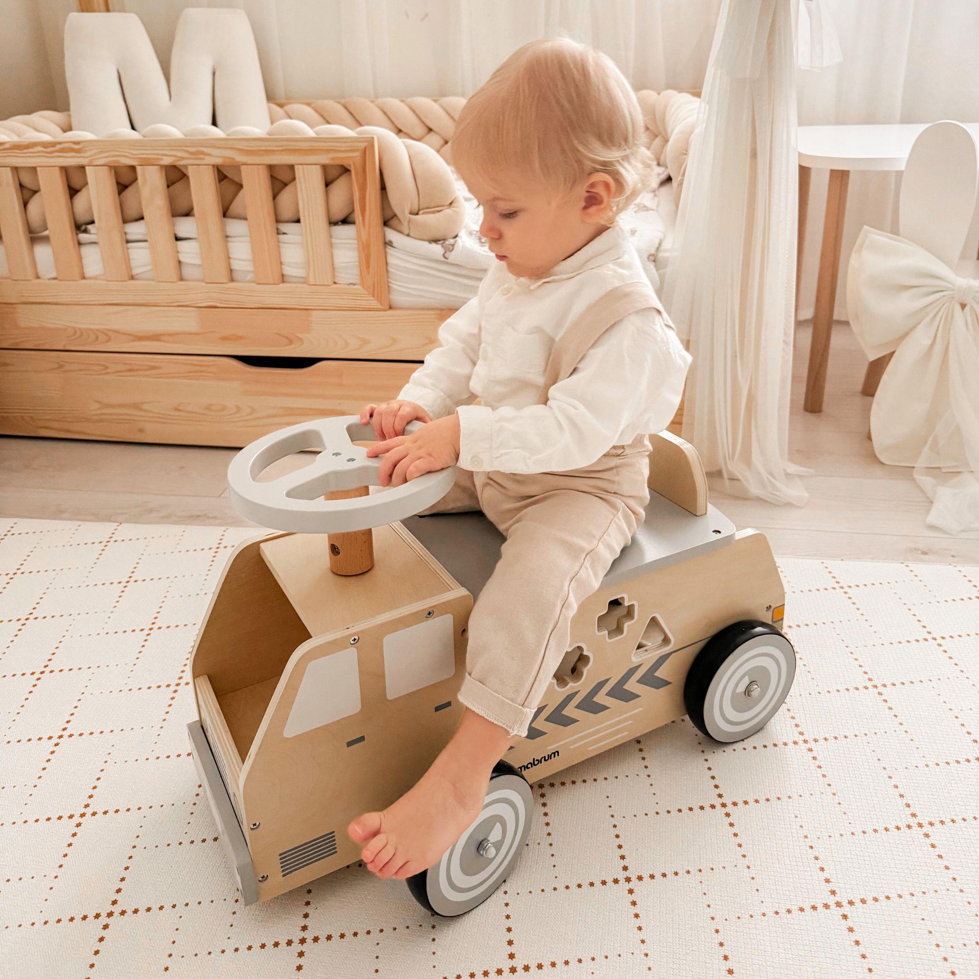 Automobil ima prekrasan, skandinavski dizajn . Obojena je prigušenim bojama koje naglašavaju prirodnu boju materijala. Kotači igračke zaštićeni su posebnom gumom koja ne klizi i sprječava grebanje površine .