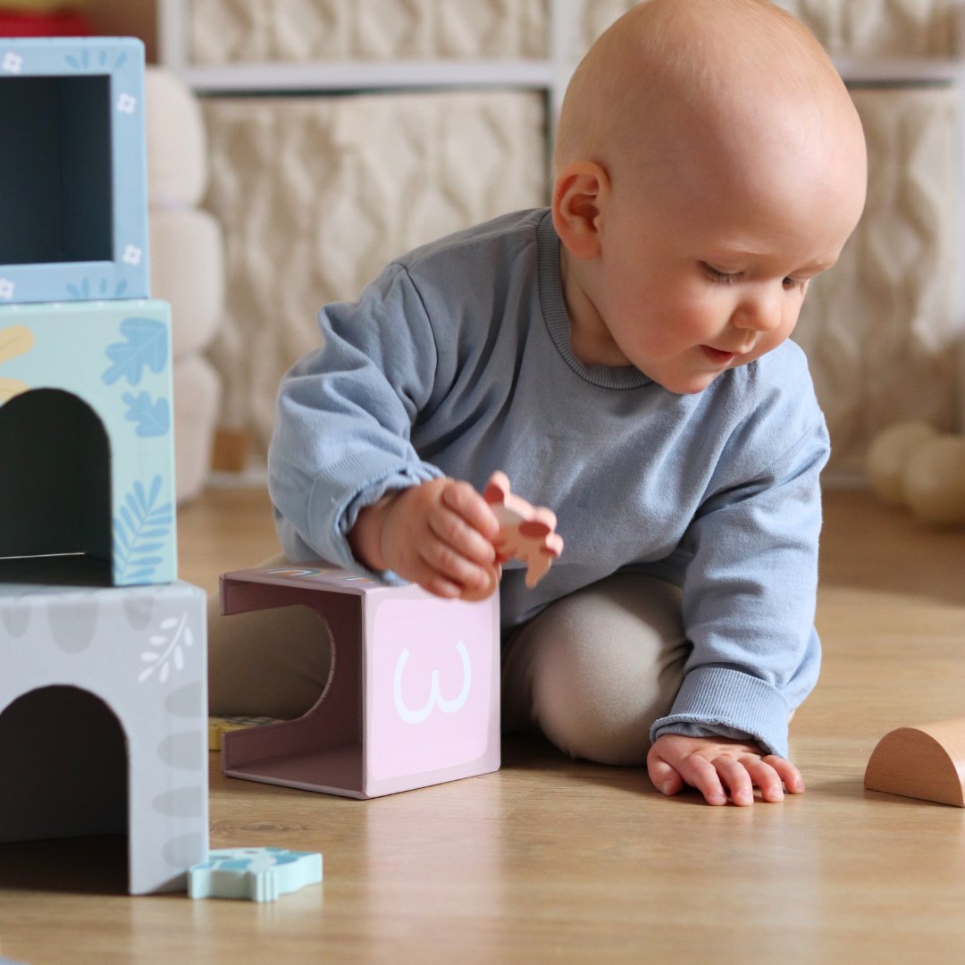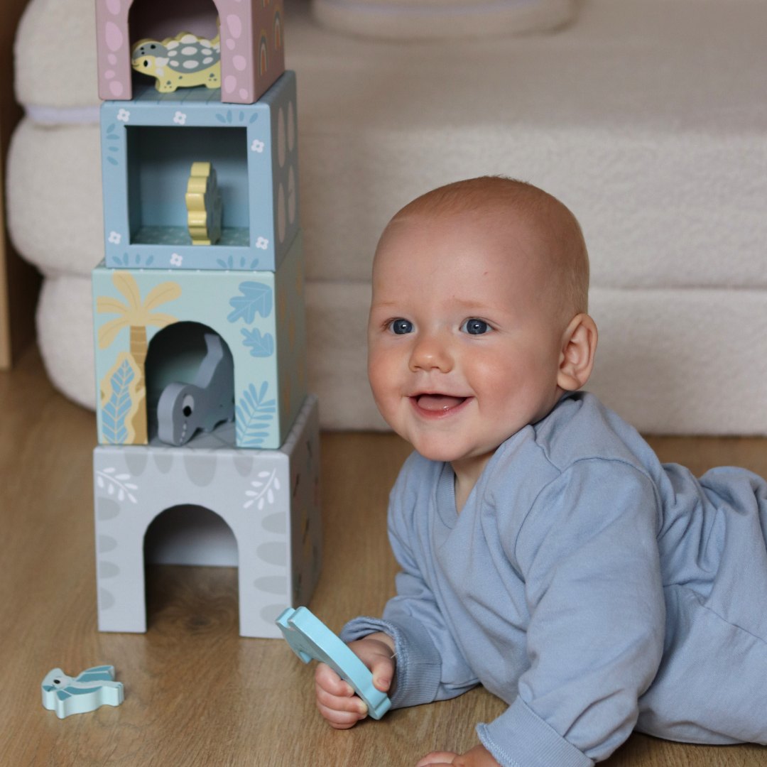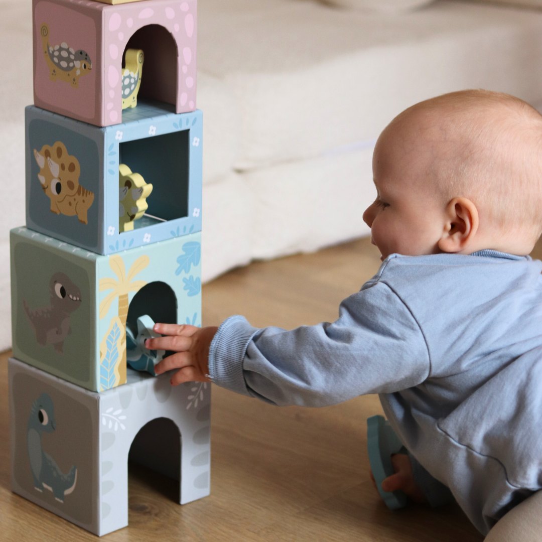 Ova igračka će vašem mališanu zasigurno pružiti puno zabave! Samo izgradite piramidu od kartonskih kutija i zatim u svaku od njih stavite odgovarajućeg dinosaura. Šareni print na kutijama djetetu služi kao trag. Dijete može ne samo graditi kule, već i koristiti igračku na mnogo različitih načina, razvijajući svoju kreativnost.