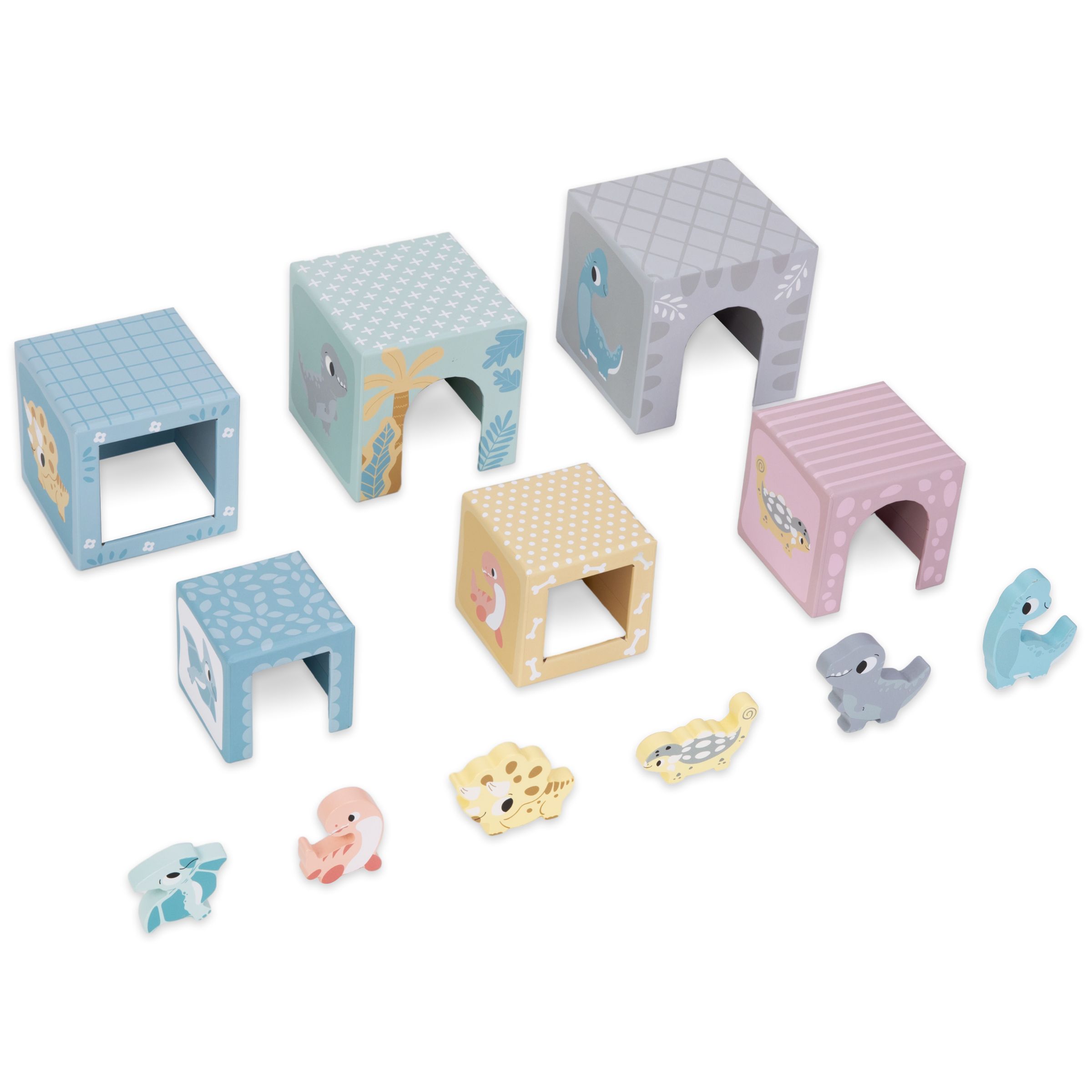 - set se sastoji od 6 kartonskih kutija različitih veličina, označenih brojevima od 1 do 6 i 6 drvenih dinosaura