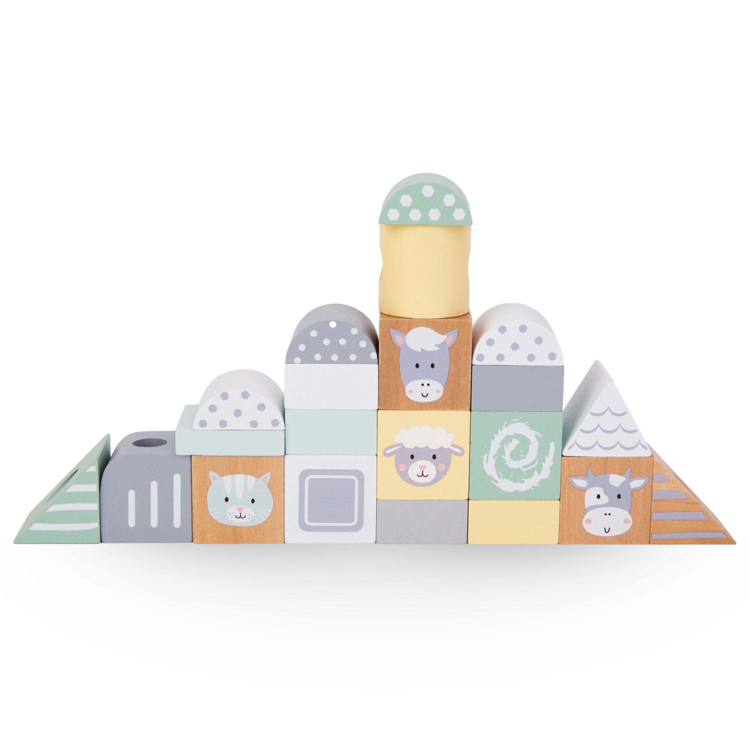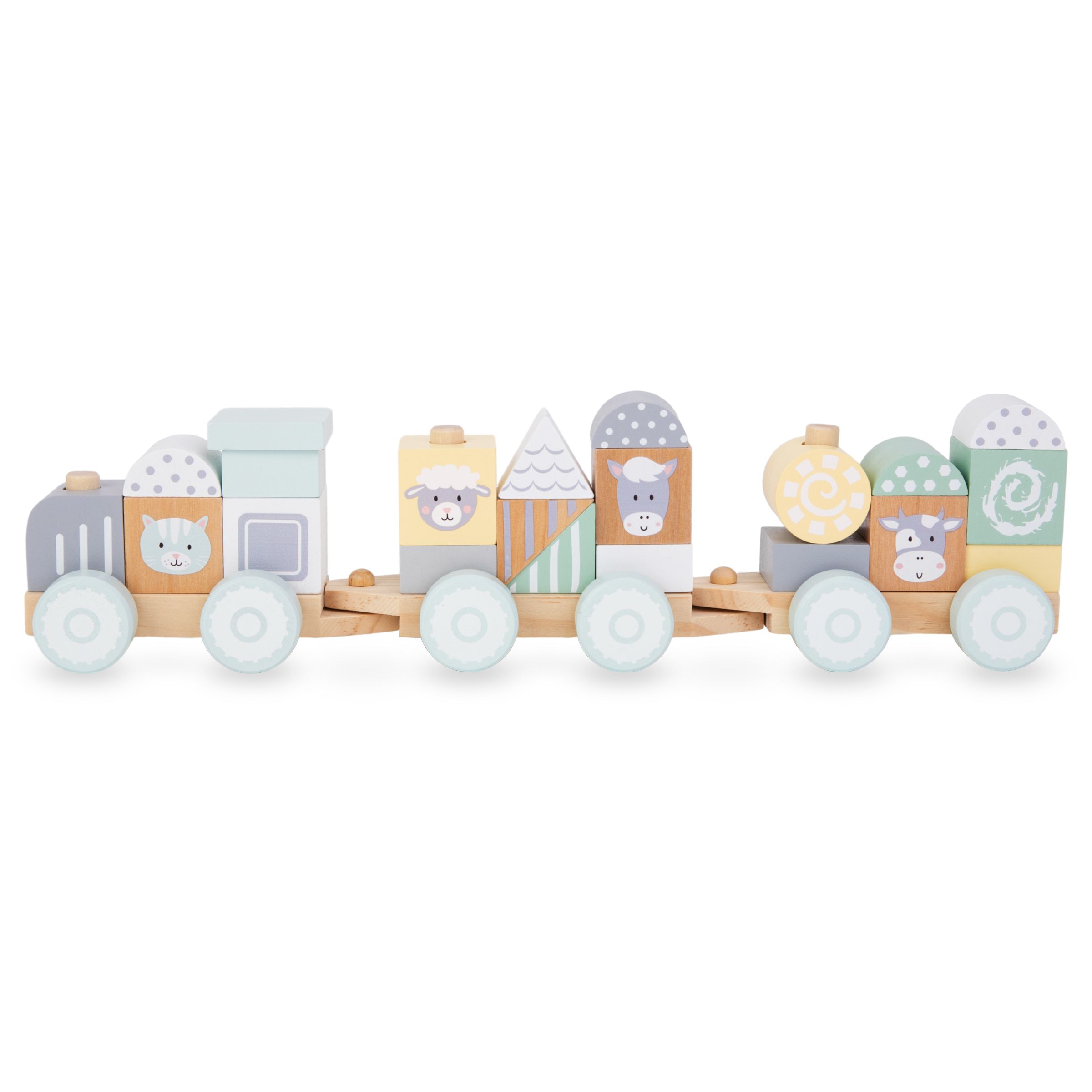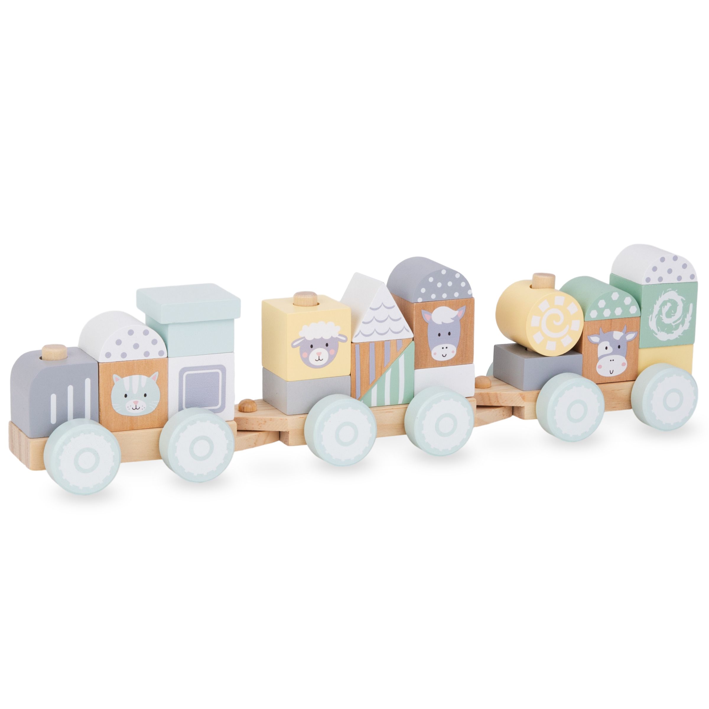 Drveni vagoni s kotačima mogu se spojiti u jedinstvenu lokomotivu. Postavljanjem šarenih blokova na posebne klinove, mališan gradi jedinstvenu strukturu vlakića . Red može svaki put izgledati drugačije! Kad je sve spremno, vrijeme je za vožnju. Tijekom toga dijete može odvojiti kolica ili promijeniti položaj blokova. Kako biste diverzificirali zabavu, set uključuje blokove sa slikom slatkih životinja - stanovnika farme.
